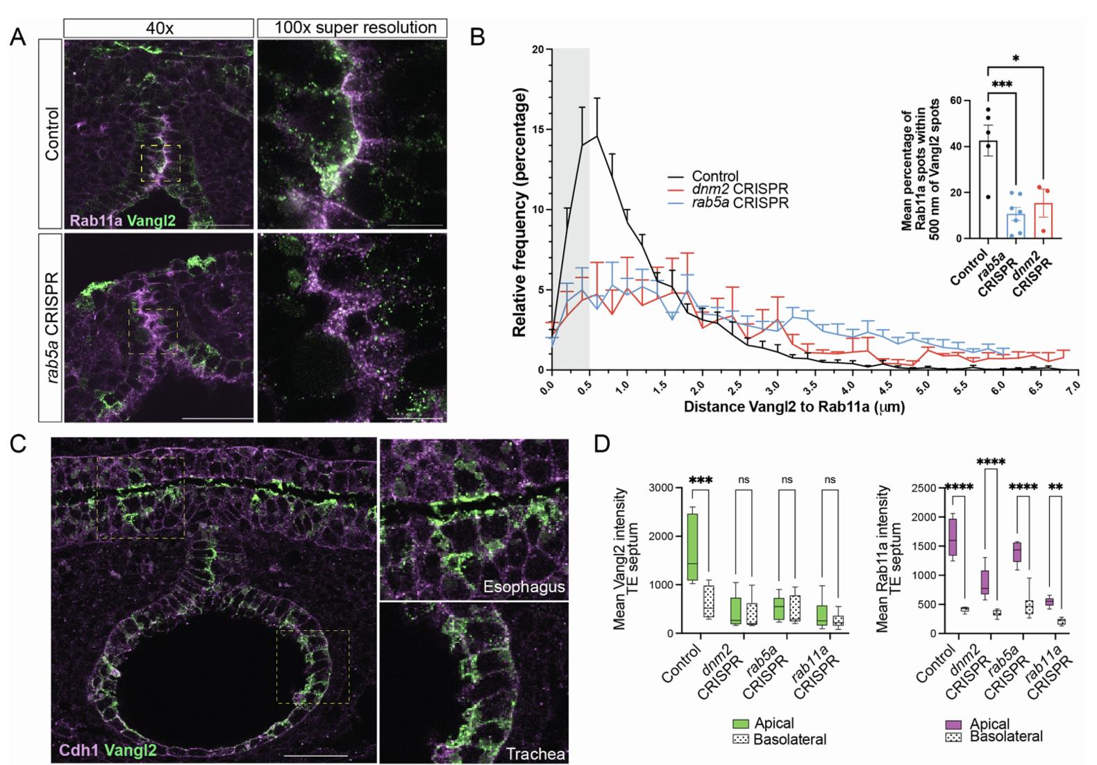 S5A: Super-resolution confocal of Rab11a-Vangl2 immunostaining in representative control and rab5a CRISPR mutant embryos.
