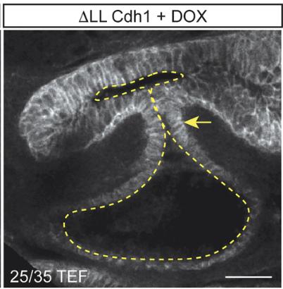 (D) Quantification of the TEF phenotype in LL-Cdh1 mutants compared with WT-Cdh1 and no DOX control embryos (mean SEM, p < 0.0001 1W-ANOVA, n = 1035 embryos from 3 transgenesis experiments).
