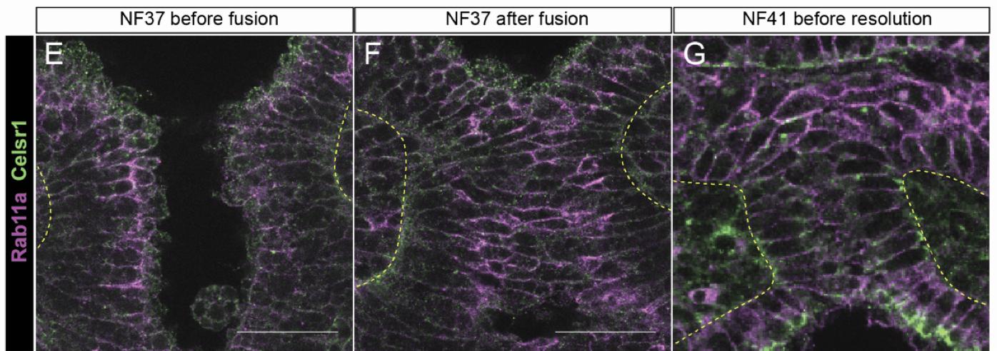 Celsr1 immunostaining during Xenopus trachea-esophageal morphogenesis. |