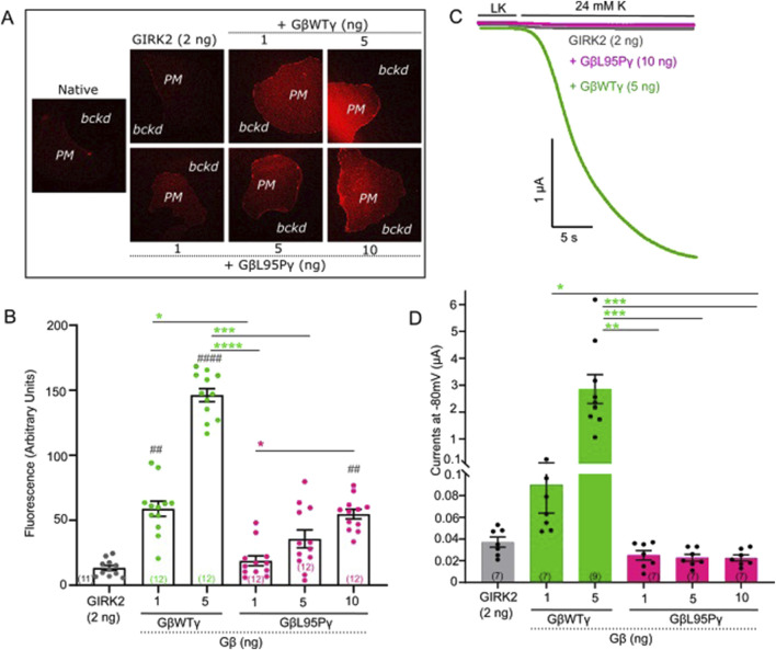 (A) Representative confocal images of oocytes expressing GIRK2-YFP channels. (B) Surface expression of GIRK2-YFP channels in the presence of GβWT (1 ng) and GβL95P (10 ng) mutant. Data shown are the mean fluorescence intensity produced by the expressed GIRK2, after subtraction of the average signal observed in native oocytes (ooct, oocyte; bckd, background). (C) Representative current traces of GIRK2-YFP channels. (D) Summary of GIRK2 activation by GβWT (1 ng) and GβL95P (10 ng). Statistical analysis: one-way ordinary ANOVA (Tukey’s test) or Kruskal–Wallis test ####p < 0.0001, ###p < 0.001, ##p < 0.01, and #p < 0.05 relative to channel-only group and ****p < 0.0001, ***p < 0.001, **p < 0.01, and *p < 0.05 relative to GβWT; ns, not significant. Number of frog donors (N) = 1. |