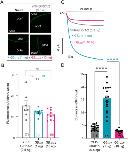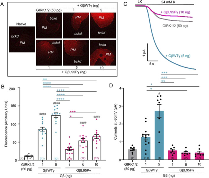 (A) Representative confocal images of oocytes expressing YFP-GIRK1/2 channels. (B) Surface expression of YFP-GIRK1/2 channels in the presence of GβWT (1 ng) and GβL95P (10 ng) mutant. Data shown are the mean fluorescence intensity produced by the expressed GIRK1/2 (ooct, oocyte; bckd, background). (C) Representative current traces of YFP-GIRK1/2 channels. (D) Summary of GIRK1/2 activation by GβWT (1 ng) and GβL95P (10 ng). Statistical analysis: one-way ordinary ANOVA (Tukey’s test) ****p < 0.0001, ***p < 0.001, **p < 0.01, and *p < 0.05; ns, not significant. Number of frog donors (N) = 1. |