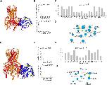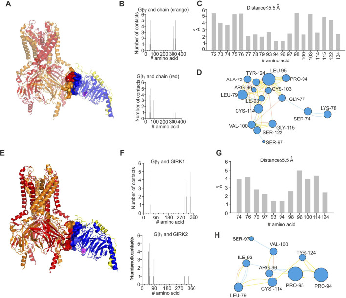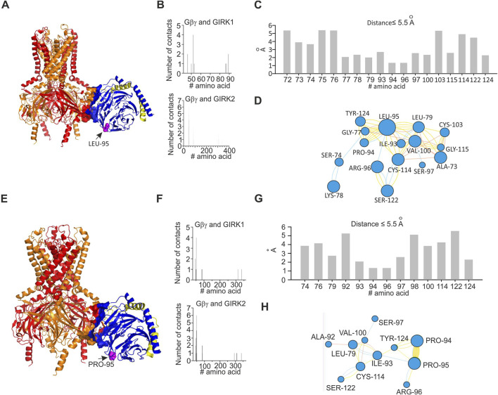 FIGURE 7. Structural analysis of impact of L95P mutation on GIRK1/2–Gβγ complex. Analysis was conducted utilizing coordinates of the largest cluster of GIRK1/2–Gβγ complex. (A) Structure of wild-type GIRK1/2–Gβγ complex (single Gβγ molecule is docked); L95 is shown as spheres and colored magenta, GIRK1 subunits are colored red, and GIRK2 subunits are colored orange. (B) Interface of GIRK–Gβγ complex, with data generated by the PRODIGY server; selection criterion: all amino acids ≤5.5 Å. The upper plot corresponds to GIRK1–Gβγ interface. The lower plot corresponds to GIRK2–Gβγ interface. Note that L95 is neither in GIRK1 nor in GIRK2 interface. (C) Amino acids in contact with L95, same criterion as in B, with data obtained from analysis of GIRK1/2–Gβγ wild-type utilizing the INTAA server. Only amino acids that belong to Gβγ are shown. (D) Analysis of non-covalent interactions of amino acids that are expected to be in contact with L95 (data shown in (C)); network is generated by the RINMAKER server. Specific interactions of L95 are summarized in Supplementary Table S1. (E) Predicted coordinates of GIRK1/2–GβL95Pγ complex, with data generated by the MutationExplorer server utilizing fast Rosetta fixbb function; P95 is shown as spheres and colored magenta. (F) Interface of GIRK–GβL95Pγ complex, with data generated by the PRODIGY server; selection criterion: all amino acids ≤5.5 Å. The upper plot corresponds GIRK1–GβL95Pγ interface, and the lower plot corresponds to GIRK2–GβL95Pγ interface. Note that P95 is neither in GIRK1 nor in GIRK2 interface. (G) Amino acids in contact with P95, same criterion as in F, with data obtained from analysis of GIRK–GβL95Pγ utilizing the INTAA server. Only amino acids that belong to Gβγ are shown. (H) Analysis of non-covalent interactions of amino acids that are expected to be in contact with P95 (data shown in (G)); network is generated by the RINMAKER server. Specific interactions of P95 are summarized in Supplementary Table S1. |