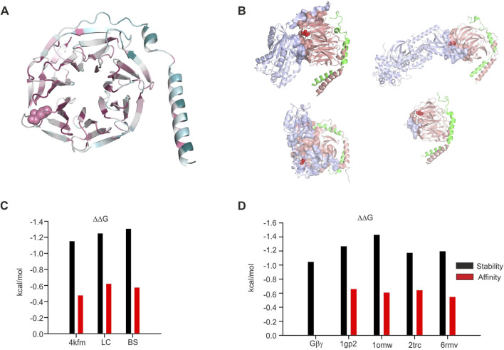 FIGURE 8. Structural analysis of the impact of L95P mutation on Gβγ−effector complexes. (A) Colored scale representation of Gβ1 generated in the ConSurf server (Ashkenazy et al., 2016). The scale is 1–9 with more evolutionary conserved amino acids colored by a more darker color. L95 is shown as spheres. (B) Gβγ−effector interface analysis. All interfaces are generated by the PRODIGY server. L95 is shown as red spheres; upper left—Gα1GDPGβγ (1gp2), upper right—β-adrenergic kinase–Gβγ complex (1omw), lower left—phosducin–Gβγ complex (2trc), and lower right—TRPM3–Gβγ (6rmv). (C) Effect of L95P mutation on protein stability and Gβγ affinity, GIRK crystal structure, and models. (D) Effect of L95P mutation on protein stability and Gβγ affinity and other effectors. All data in (C,D) were calculated utilizing the MCSM server. |