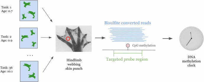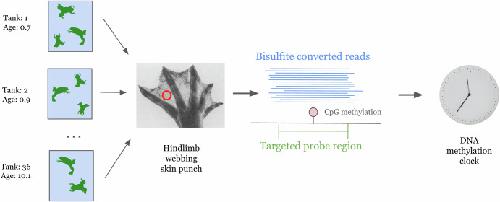 DNA methylation clocks have been widely used for accurate age prediction, but most studies have been carried out on mammals. Here we present an epigenetic clock for the aquatic frog Xenopus tropicalis, a widely used model organism in developmental biology and genomics. To construct the clock, we collected DNA methylation data from 192 frogs using targeted bisulfite sequencing at genomic regions containing CpG sites previously shown to have age-associated methylation in Xenopus. We found highly positively and negatively age-correlated CpGs are enriched in heterochromatic regions marked with H4K20me3 and H3K9me3. Positively age-correlated CpGs are enriched in bivalent chromatin and gene bodies with H3K36me3, and tend to be proximal to lowly expressed genes. These epigenetic features of aging are similar to those found in mammals, suggesting evolutionary conservation of epigenetic aging mechanisms. Our clock enables future aging biology experiments that leverage the unique properties of amphibians.