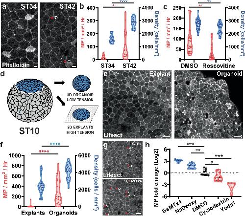 Fig. 2: Macropinocytosis is associated with tissue crowding and low levels of tension. a Image of Xenopus stained with phalloidin (white) at ST34 (left) and ST42 (right, asterisk highlight actin ruffles). Scale bar 10 μm. b Quantification of cell density (blue; right axis) and macropinocytotic events (MP, red; left axis) at ST34 and ST42 (n = 3 exp. and 15 embryos per stage for cell density, p-value = 3.43e-10; 4 exp. and 6 embryos for macropinocytotic events at ST34 and 5 exp. and 16 embryos at ST42, p-value = 0.0282). c Quantification of cell density (blue; right axis) and macropinocytotic events (red; left axis) in embryo treated or not with Roscovitine for 24 h (n = 4 exp. and 18 control embryos and 21 Roscovitine-treated embryos for MP events, p-value = 0.0019; 3 exp. and 29 control embryos and 28 Roscovitine-treated embryos for goblet cell density, p-value = 0.0045). d Representation of the generation of 3D organoids or 2D explant plated onto fibronectin coated coverslip. Adapted from61,62. e Representative images of the surface of 2D explant (left) or 3D organoids (right) expressing Lifeact-FP. Scale bar 30 μm. f Quantification of cell density (blue; right axis) and macropinocytosis (red; left axis) in 2D explants or 3D organoids (n = 6 experiments with 22 explants and 23 organoids; MP p-value = 2.00e-06 and density p-value = 5.97e-07). g Image of actin ruffles (asterisk) in the epithelium of an embryo expressing Lifeact-FP before (up) and after (down) treatment with GsMTx4. Scale bar 30 μm. h Quantification of the fold difference in macropinocytosis level between 1 h before and 1 h after treatment with DMSO (mock treatment, n = 9 embryo), GsMTx4 (n = 5 embryo; p-value = 2.03e-06), NaDeoxy (n = 5 embryo; p-value = 0.0012), Mβ Cyclodextrin (n = 11 embryo; p-value = 0.0260), or Yoda1 (n = 5 embryo; p-value 3.00e-05). All tests are two-sided unpaired t-tests. Source data are provided as a Source Data file.