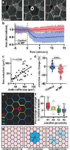 Fig. 3: Macropinocytosis leads to cell size reduction. a Time lapse of a macropinocytotic event in tissue labeled with Lifeact-FP. The dotted line represents cell original size, highlighting the cell size reduction. Scale bar 10 μm. b Quantification of cell size change in cells with (blue) or without (red) a macropinocytotic event (MP) using cells synchronized to the onset of macropinocytosis and normalized to original cell size (n = 3 exp. and 43 cells total; mean and SD). c Correlation between the apical size reduction and the size of actin ruffle (n = 3 exp. and 43 cells). d Quantification of the change in junction length in cells with and without macropinocytosis (n = 4 exp. and 40 cells; two-sided unpaired t-test, p-value = 1.23e-07). e Graphical depiction of a cell with different junction types labeled (N1-N4) in different colors based on their distance from the macropinocytotic event. f CellFit analysis of time lapse movies quantifying the change in relative junctional tension before and after macropinocytosis (n = 25 events; see Fig. S1f; box = interquartile, center line = median, error bars = min/max; two-sided paired t-test of before and after the event p-value N1 = 0.0001, N2 = 0.0281, N3 = 0.4890, N4 = 0.3492). g Model comparing the effect of cell extrusion (center) or macropinocytosis (right) occurring in the cell (asterisk) of a crowded epithelium (left). Blue color highlights the putative effect on cells/neighbors. Source data are provided as a Source Data file.