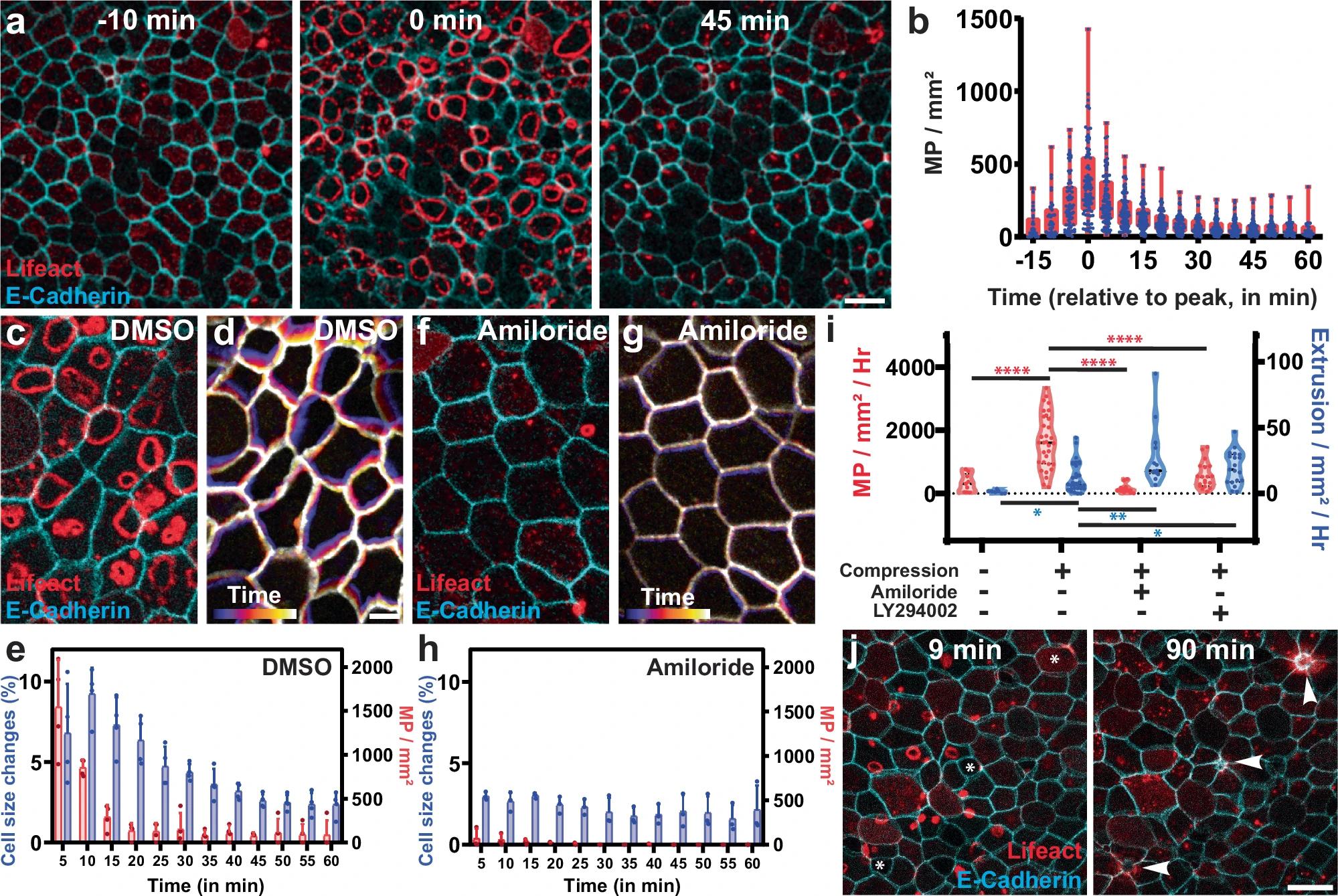 Fig. 5: A wave of macropinocytosis remodels the epithelium in response to external tissue compression. a Representative image of an embryo injected with Cadherin-FP (cyan) and Lifeact-FP (red) before (left), during (middle), and after (right) a wave of macropinocytosis induced by tissue compression. Scale bar 30 μm. b Quantification of the wave of macropinocytic events (MP) upon compression (n = 80 scan areas from 32 embryos from 12 exp.; bars = mean, error bars = SD). c, f Representative images of embryos injected with Cadherin-FP (cyan/white) and Lifeact-FP (red) 5 min after compression in control (c) or Amiloride treated (f) embryos. Scale bar 10 μm. d, g Representation of tissue remodeling over 10 min using a temporal color code of control (d) or Amiloride (g) treated embryos. Scale bar 10 μm. e, h Quantification of tissue remodeling (i.e., overall change in cell apical area) (blue; left axis) and macropinocytotic events (red; right axis) in DMSO (e) and Amiloride treated (h) embryos upon compression (n = 3 exp.; bar = mean, error bars = SD). i Quantification of macropinocytotic events (red; left axis) and cell extrusion events (blue; right axis) in non-compressed (n = 9 embryos; MP p-value 5.00e-05, extrusion p-value = 0.0168) and compressed embryos in either DMSO (n = 32 embryos) or treated with amiloride (n = 13 embryos; two-sided unpaired t-tests; MP p-value = 1.31e-07, extrusion p-value = 0.0028) or LY294002 (n = 19 embryos; MP p-value = 4.19e-06, extrusion p-value = 0.0272). j Representative image of an embryo injected with Cadherin-FP (cyan) and Lifeact-FP (red) having both macropinocytotic events and cell extrusion (arrowhead) upon compression. Scale bar 30 μm. Source data are provided as a Source Data file.