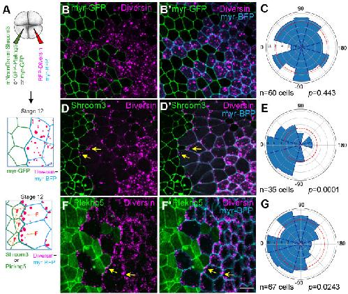 Fig. 4. Diversin puncta orient towards apically constricting neighboring cells. (A) Experimental scheme. Clones expressing control myr-GFP (20 pg), mNeonGreen-Shroom3 (20 pg), or GFP-Plekhg5 (20 pg) mRNA. RFP-Diversin-expressing cells are marked with myr-BFP (cyan). (B-B″,D-D″,F,F′) Random distribution of RFP-Diversin (red) in cells adjacent to control mem-GFP clones at stage 12.5. (B,B′) Polarized accumulation of RFP-Diversin toward neighboring mNeonGreen-Shroom3 (D,D′), and GFP-Plekhg5 (F,F′) expressing cells. Yellow arrows show the enrichment of Diversin puncta. Scale bar: 20 µm. (C,E,G) Rose plots show Diversin puncta orientation relative to the border of adjacent control cells (C), mNeonGreen-Shroom3-expressing cells (E) and GFP-Plekhg5-expressing cells (G), respectively. (0° is perpendicular to the border). Data represent three embryos per condition. Chi–square analysis confirms random distribution in controls (B-B″,C) but not in the cells adjacent to Shroom3 (D-D″,E) or Plekhg5-expressing cells (F-F″,G), respectively. |