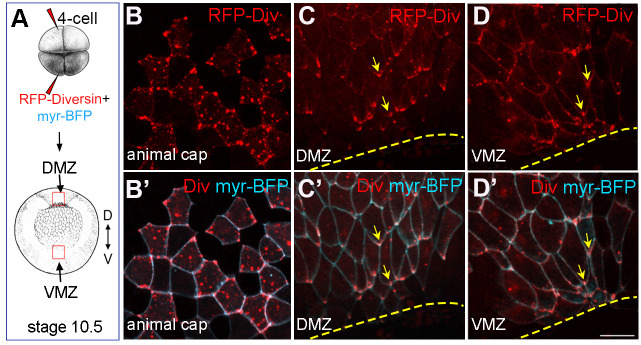 Fig. 3. Diversin polarizes in the cells adjacent to the blastopore lip during gastrulation. (A) Schematic of RNA injections. RFP-Diversin (200 pg) and myr-BFP (50 pg) mRNAs were co-injected into the animal pole or the marginal zone of Xenopus four-cell embryos. (B) Animal view of early gastrula, (C-D′) vegetal view of stage 10.5 gastrula with red dashed boxes corresponding to the dorsal and ventral marginal zones (DMZ and VMZ) at the blastopore lip. (B-D″) RFP-Diversin localization in animal ectodermal cells (B,B′), or cells adjacent to the DMZ (C,C′) and VMZ (D,D′) blastopore lip at stage 10.5. Yellow arrows indicate asymmetric Diversin accumulation at cell corners. Scale bar: 50 μm. Data represent five to ten embryos per group. |
