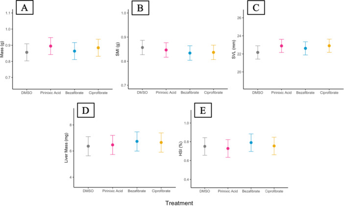 Figure 5. Marginal mean ± 95% CI of mass (A), SMI (B), SVL (C), liver mass (D), and HSI (E) for X. laevis exposed to a DMSO vehicle control or a xPPAR agonist (pirinixic acid, bezafibrate, ciprofibrate). n = 11–12 per treatment.