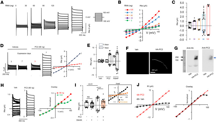Figure 1. WT PC2 expresses currents in Xenopus oocytes.(A) Currents in Xenopus oocytes injected with vehicle (water), or mRNA coding for WT PC2. Currents were recorded by 2-electrode voltage-clamp in a bath solution with 100 mM NaCl. Holding potential was –50 mV, and 400 ms steps were applied from –100 mV to 100 mV in 20 mV increments. (B) Steady-state (at 400 ms) current-voltage (I-V) relationship curves from A. (C) Mean ± SEM for inward and outward currents at –100 and 100 mV. n = 8, 7, 4, 10, 4 for 30, 60, 90 and 120 ng mRNA injection, P <0.0001, 1-way ANOVA. (D) Step currents and steady-state I-V from oocytes recorded 3 or 7 days after injection. (E) Mean ± SEM for inward and outward currents from oocytes recorded at 5 or 7 days. P <0.01, 7 days versus 5 days for PC2 (90 ng) or F604P (30 ng mRNA injected); P < 0.001 for PC2 (n = 5) versus F604P (n = 5) at 5 days; P < 0.01 for PC2 (n = 9) versus F604P (n = 7) at 7 days. n = 5 and 7 (5- and 7-day) for vehicle injected group. (F) Immunofluorescence staining using antibody against HA tag. Scale bar: 150 μm. (G) Western blot of oocyte lysates probed by anti-PC2 or anti-HA antibody. Oocytes were injected with vehicle or C-terminal HA-tagged PC2 in F and G. Blue arrow: HA-tagged PC2; black arrow: 250 and 100 kDa protein standards. (H) Oocytes were injected with vehicle or PC2 mRNA. I-V curve of steady-state current at 400 ms were scaled and overlaid. (I) Oocytes were injected with vehicle or WT PC2 and with or without D643K PC2 mutant at 1:1 mRNA ratio. Inset showed I-V relationship, n = 10 for all. (J) Currents were recorded in a bath solution containing 100 mM KCl. Scaled and overlaid currents. Two-tailed unpaired Student’s t test for E and I. |