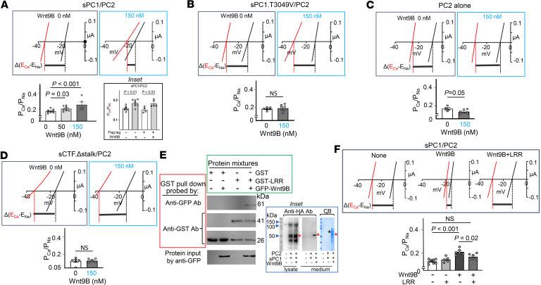 Figure 6. Purified Wnt9B protein increases Ca2+ permeability of heteromeric sPC1/PC2 channel.(A–D) Oocytes expressing sPC1/PC2 (n = 8, 7, and 5 for 0, 50, and 150 nM Wnt9B, respectively) (A), sPC1.T3049V/PC2 (n = 6 and 8 for 0 and 150 nM Wnt9B, respectively) (B), PC2 alone (n = 4 and 7 for 0 and 150 nM Wnt9B, respectively) (C), or sCFT.Δstalk/PC2 (n = 6 and 7 for 0 and 150 nM Wnt9B, respectively) (D) were incubated overnight with either vehicle or purified Wnt9B (50 or 150 nM). PCa/PNa was calculated based on reversal potential shift between 100 mM CaCl2 and 100 mM NaCl. Inset in A shows that sPC1 with or without Flag-tag (plus PC2) responded to Wnt9B. (E) Biochemical interaction between PC1 leucine-rich repeat (LRR) and Wnt9B. Mixtures containing purified GFP-Wnt9B, GST-LRR, or GST alone were subjected to pull-down using GST-sepharose beads. Pull-down samples were probed with anti-GFP or anti-GST antibodies. Protein input samples were probed by anti-GFP Ab. Note that purified GST-LRR fusion proteins also contained some cleaved GST alone. Inset shows a ~51 kDa HA-tagged NTF fragment is released into the medium in the presence of Wnt9B. Control or oocytes expressing sPC1/PC2 were incubated with or without Wnt9B (300 nM) overnight. sPC1 contains an N-terminal HA-tag immediately after the κIgG signal peptide. The medium was concentrated 10-fold for Western blot analysis by anti-HA antibody. Proteins in the medium were also stained by Coomassie blue (CB). Red and black asterisks indicate HA-tagged NTF fragment and GST-Wnt9B, respectively. Experiment was repeated 3 times. (F) Oocytes expressing sPC1/PC2 were incubated overnight with vehicle or purified Wnt9B (150 nM), with or without LRR (1,500 nM). PCa/PNa was determined as in A–D. Data are shown as mean ± SEM. n = 8, 5, 6, and 6 for no treatment, LRR, Wnt9B, and LRR+Wnt9B treated groups, respectively. Two-tailed unpaired Student’s t test for A–D and F. |