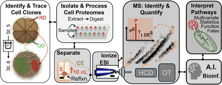 Figure 1. Strategy for affordable single‐cell proteomics using capillary electrophoresis (CE), electrospray ionization (ESI), and mass spectrometry (MS). Neural (D11) and epidermal (V11) precursor blastomeres of 16‐cell Xenopus laevis embryos (St. 5) were microinjected with red/green fluorescent dyes, tracked to the blastula stage (St. 8), and isolated for proteome analysis. CE was coupled to a legacy Orbitrap (Q Exactive Plus, Thermo) with electrophoresis‐correlative (Eco) ion sorting and real‐time data‐dependent acquisition (DDA). Artificial intelligence (CHIMERYS) resolved the resulting highly chimeric tandem mass spectra, achieving sensitivity comparable to modern tribrid instruments. D11 and V11 descendants were profiled to reveal proteome reorganization during early differentiation. (Created with BioRender.com).