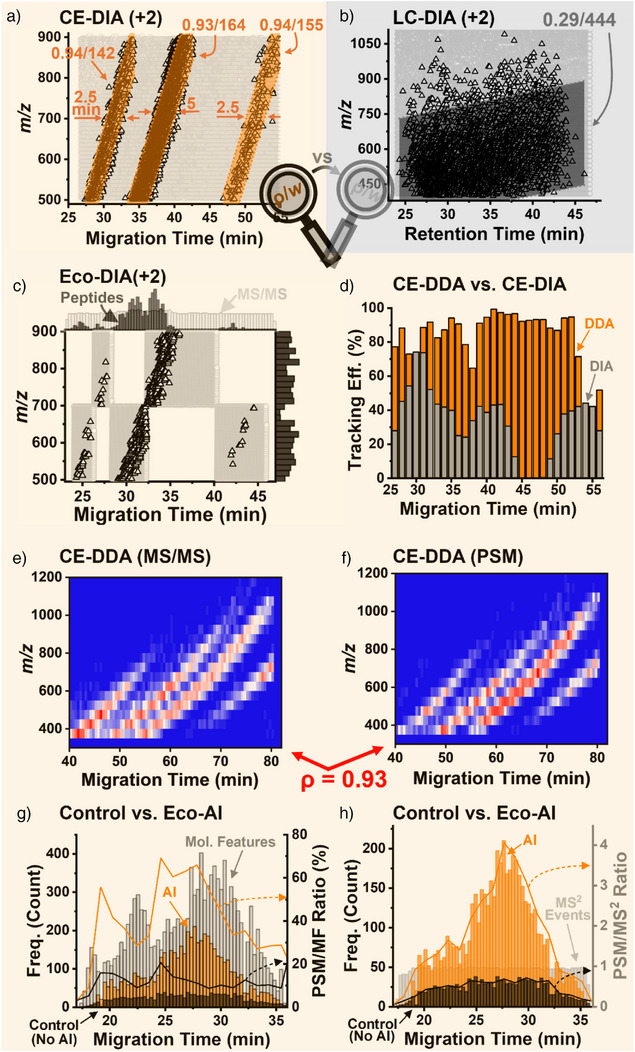 Figure 2. Advancing deeper proteomics through Real‐Time Electrophoresis‐Correlative (Eco) data acquisition with AI‐aided data processing on a legacy Orbitrap mass spectrometer. A 10 ng HeLa digest was analyzed by CE– and nanoLC–MS. a) Eco sorting grouped the peptide ions into temporally correlated data clusters based on mass‐to‐charge (m/z) and separation time (2+ charge shown, Pearson ρ ≥ 0.93), whereas b) nanoLC spread them broadly over the dimensions (ρ = 0.29). c) Eco‐data independent acquisition (DIA), using 5 segmented m/z–migration time windows, identified ∼38% more proteins than the control while using <50% of the analytical bandwidth. d) Data‐dependent acquisition (DDA) with standard isolation width (1.6 Th) tracked the m/z–migration correlation with up to 99% success. e), f) MS/MS events aligned with the density of the identified peptide spectral matches (PSMs), reflecting high real‐time sequencing efficiency (ρ = 0.93). g), h) AI‐assisted data processing software (CHIMERYS, Thermo) improved deconvolution of highly chimeric spectra, identifying over 3× more molecular features (MFs). Together, these results demonstrate that Real‐Time Eco–AI enables deep proteome coverage even on earlier‐generation Orbitrap instruments.