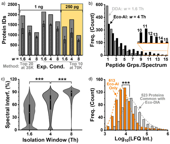 Figure 3. Configuration of empirical proteome depth using electrophoresis‐correlative data acquisition with AI‐aided data processing (Eco–AI). HeLa digest (1 ng and 250 pg) was analyzed under fixed MS cycle duration while varying key parameters: quadrupole isolation window (w), number of targeted precursor ions (Top 10 versus Top 20), and Orbitrap resolution (35 000 versus 70 000 FWHM). a) Eco–AI identified up to 1799 proteins in 15 min from ∼250 pg of digest—approximating the protein content of a single HeLa cell. b) The MS/MS spectra showed an increased peptide group depth (examples in Supporting Information), while c) wider quadrupole precursor ion isolation window widths exacerbated spectral interference. d) Label‐free quantification (LFQ intensity) confirmed superior sensitivity of Real‐Time Eco–AI over the recent (scheduled) Eco CE–DIA method. ***p < 0.001, Mann–Whitney U test.