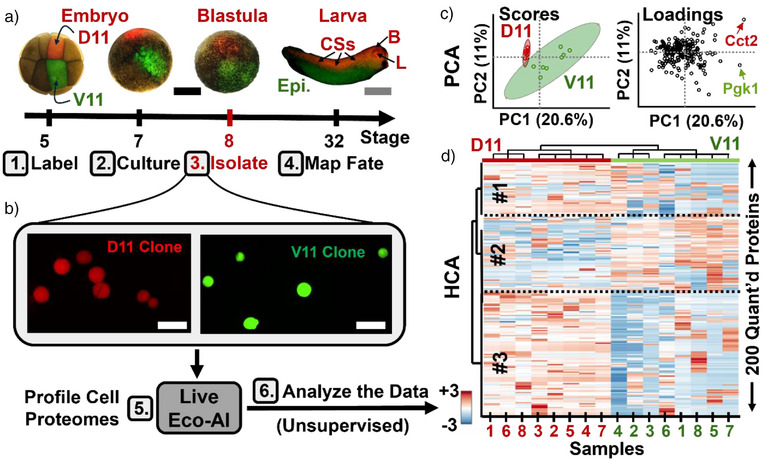 Figure 5. Proteome profiling of single cells undergoing differentiation in Xenopus laevis embryos. a) Dorsal‐animal (D11) and ventral‐animal (V11) blastomeres (n = 8) were microinjected with red and green fluorescent dyes at the 16‐cell stage; these lineages give rise to neural (central somites, CSs) and epidermal (Epi.) tissues in the larva, respectively. b) Descendant cells (∼50–75 µm) were isolated at the blastula stage using a micropipette under fluorescence guidance. ∼500 pg of proteome digest (∼2% of total cellular protein) was analyzed using the Real‐Time electrophoresis‐correlative AI workflow. c) Principal component analysis (PCA) of the cell proteomes revealed systematic differences among sample types (scores and loadings plots), driven by varying protein expression levels. Representative proteins are labeled. d) Hierarchical cluster analysis (HCA, z‐score scale) of the top 200 proteins grouped them into three major abundance profiles (#1–3), supporting cell‐type‐specific proteome remodeling. Scale bars: 500 µm (black), 2 mm (gray), 100 µm (white).