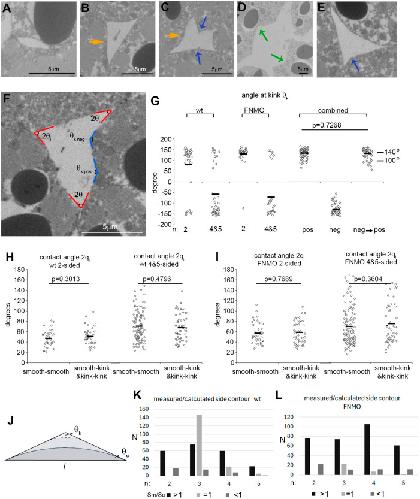 Fig. 3. Gap side shapes. (A-E) Side shapes inconsistent with capillarity. Yellow arrows indicate S-shaped contours; blue and green arrows indicate kinks. (F) A gap with contact angles 2θi (red) and kink angles θk (blue) indicated. (G) θk from two-, and four- and five-sided gaps from normal and FN-depleted PM (21 and 28 sections). Values combined (right) with subpopulations at 140° and 100° are indicated. Averages are indicated by black bars; P indicates significance (ANOVA; Mann–Whitney U-test P=0.5335). (H,I) Contact angles of 2θi between smooth and kinked sides in normal PM (H) (14 and 15 TEM sections) and FN-depleted PM (I) (13 and 11 TEM sections) for two-sided, and four- and five-sided gaps. Averages are indicated by black bars; P indicates significance (one-way ANOVA). (J) Schematic showing the increase of contour length at constant l and angle θc, up to kink formation at θk. Dark grey indicates a circular contour; light grey indicates that the straight sides connected by the curved dashed line have an increased contour length for the same values of l and θc because the contour bulges outward, and a straight-sided kink has an even longer contour. (K,L) Ratio of measured/calculated contour lengths (Sm/Sc) for different n: normal PM (K) and FN-depleted PM (L), from 14, 12, 6, 6, 13, 17, 11 and 11 TEM sections (from left to right) (see measured data points in Fig. S5). |