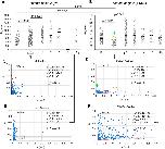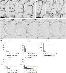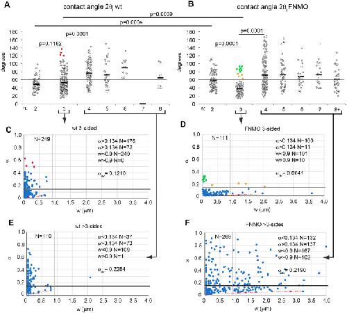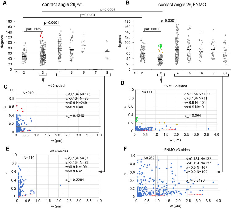 Fig. 6. Contact angle subpopulations. (A,B) Angles of 2θi at the corners of n-sided gaps: normal PM (A) and FN-depleted PM (B). Horizontal grey reference line is at 60°. Averages are indicated by black horizontal lines; P indicates significance (one-way ANOVA). Data are from 24 (A) and 30 (B) TEM sections. (C-F) Relative adhesiveness (α) versus contact width (w) contacts ending in gaps with n=3 (C,D) or n>3 (E,F) normal PM (C,E) or FN-depleted PM (D,F). Grey vertical reference lines indicate w=0.9 μm; horizontal reference lines indicate α=0.134 (i.e. 60°); red dashed lines indicate a slight increase of lower boundary of distribution with w. Corresponding data points are labelled in A and C: red indicates an absence in B,D. Green and orange points in B and D represent different subpopulations in which w is increased (orange) or not affected (green) by FN depletion. N, number of measurements; N values for specific α and w ranges are indicated on the right; αav indicates average of total. Data are from (C) 12, (D) 17, (E) 6; and (F) 6 TEM sections analyzed from 6 (C,E) and 3 (D,F) embryos. |