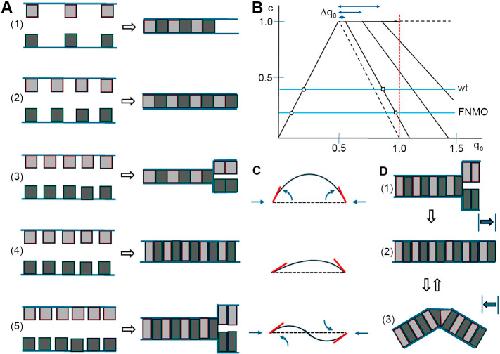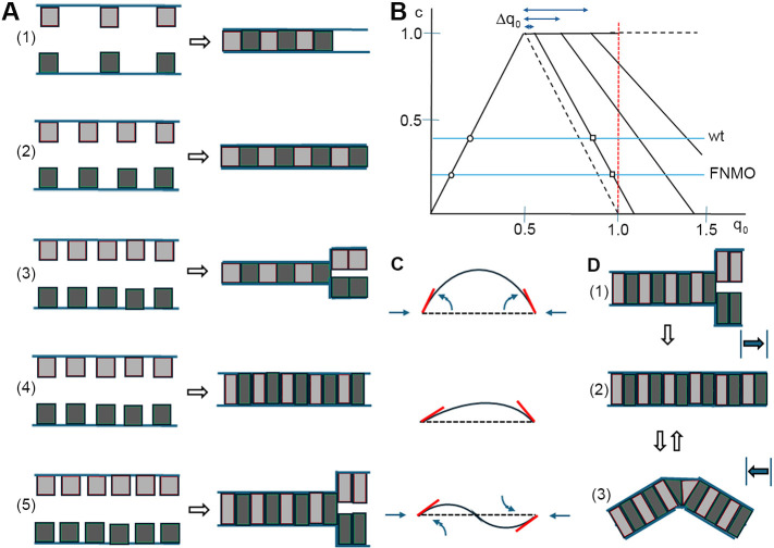 Fig. 7. PCM adhesion. (A) Stub interdigitation. (1) Stubs density q0<0.5 leads to contact patches and stub-free surfaces. (2) At q0=0.5, the whole domain is in contact. (3) Non-deforming stubs: q0>0.5 leads to contact patches and excess stubs in gaps. (4) Compressible stubs: contacts form at q0>0.5. (5) At higher stub densities, interdigitation ceases and compressed stubs form gaps. (B) Fraction of cell surface engaged in contacts (c) as a function of stub density (q0). Initial increase until c=1 at q0=0.5 (1 and 2 in A). With non-deforming stubs, c decreases for q0>0.5 (dashed line) (3 in A). Compression permits interdigitation beyond q0=0.5 (4 in A). After the limit of interdigitation at q0=0.5+Δq0, c decreases (5 in A). Blue lines indicate normal and FN-depleted PM; red dashed line indicates q0=1. (C) Bending (curved arrows) or buckling (straight arrows) upon compression of stiff gap surfaces at given side lengths (dashed lines), angles (dashed lines, red tangents) and contour lengths (solid lines). (D) Stretching of a surface domain (1) can remove a gap by additional stub interdigitation (2) (white arrow). Compression of the expanded domain leads to buckling (3). Alternating stretching and compression (black arrows on the right) causes fluctuating buckling [white arrows between (2) and (3)]. |