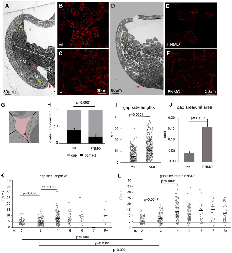 Fig. 1. Cell-packing density and gap size. (A) A stage 11 gastrula, dorsal side. NE, neuroectoderm; CM, chordamesoderm; PM, prechordal mesoderm. Yellow arrows indicate tissue movement; red arrowhead indicates blastopore; red arrow indicates archenteron tip. (B,C) Ectodermal surface (B) and deep PM cells (C) stained with FN antibody. (D) Stage 11 gastrula FN knockdown. Red arrowhead indicates the position of the blastopore in the absence of archenteron. (E,F) FN staining after knockdown. (B,C,E,F) Five specimens stained for each sample. (G) Interstitial gap (pink), side lengths (l), contact angle 2θi and cell-cell contacts (bold black lines) are indicated. (H) Contact abundance as fraction, c, of total cell surface (black); the fraction of the remaining surface in gaps (gray), in normal (wild type, 24 embryos) and FN-depleted PM (FNMO, 12 embryos) (data from Barua et al., 2021). (I,J) Side lengths l (I) and gap area (J) per tissue section area. (K,L) Gap side length (l) as function of gap side number (n). Gray horizontal reference line through the lowest average (at wild type n=2). (I-L) Measurements for wild type are from 24 TEM images, six embryos; measurements for FNMO are from 30 TEM images, three embryos. Averages are indicated by black horizontal bars; P indicates significance levels (one-way ANOVA); vertical bars indicate s.d. |