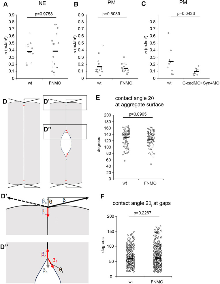 Fig. 2. Tissue and cell surface tensions. (A-C) Tissue surface tension measured by ADSA in normal and FN-depleted neural ectoderm (A), PM (B) or C-cadherin- and Syndecan-4-depleted PM (C). Each dot represents an aggregate from five to seven tissue explants. (D-D″) Schematic cell contact without (left) or with (right) interstitial space in cell contact (D), and angles and tensions at the tissue surface (D′) and at the gap (D″) as in Eqns 1a,b and 2a,b. (E,F) Contact angles are 2θ at the aggregate surface (E) and 2θi at gaps (F) in normal and FN-depleted PM, from three aggregates per treatment (E) or from 19 (wild type) and 30 (FNMO) TEM sections of gastrulae (F). Averages are indicated by black bars; P indicates significance levels (one-way ANOVA). |