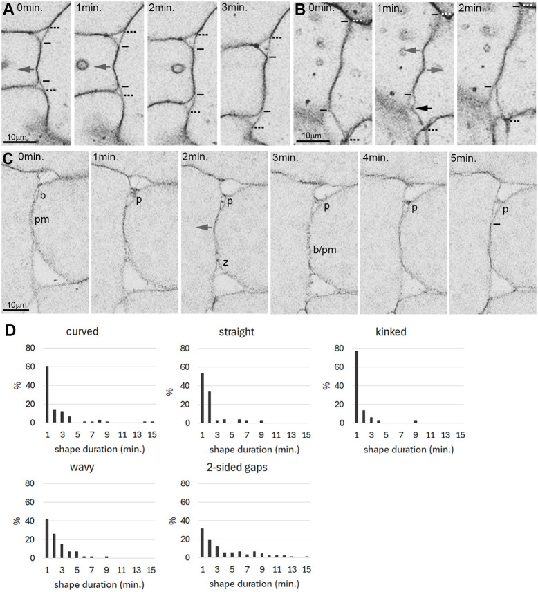 Fig. 5. Dynamic contact shapes. (A-C) Time lapse frames. Black arrows indicate kinks at gap surfaces; gray arrows indicate kinks at contacts; b, a two-sided gap; p, peeling apart of cells at the contact margin; pm, membrane separation (it is rare for contacts to widen over their whole extent); z, zipping up of membranes at contact margins; bars indicate boundaries of expanding or shrinking contacts; dashed bars indicate surface domains with gaps and contact. (D) Duration of contact shapes, 26 contacts followed for 17-30 min each using the same explants as in Fig. 4. |