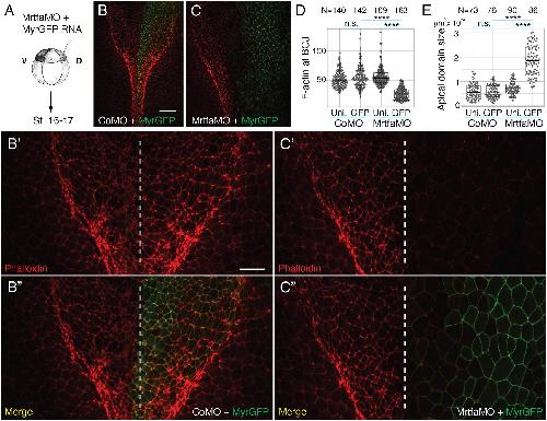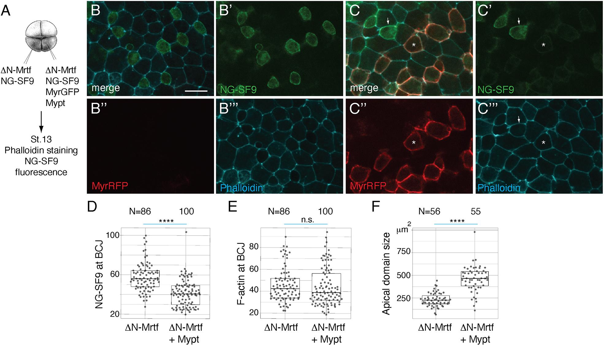 Fig. 7. Myosin phosphatase reduces Myosin II and increases apical domain size in cells expressing ΔN-Mrtf. (A) Scheme of injections. Four-cell embryos were injected into one ventral-animal blastomere with 25 pg mNeonGreen-SF9 (NG-SF9), 250 pg ΔN-Mrtf, 20 pg MyrRFP and 100 pg Mypt RNAs, as indicated. Injected embryos were fixed at stage 13, stained with phalloidin and imaged. (B-C‴) Images of cells mosaically expressing ΔN-Mrtf and NG-SF9 alone (B-B‴) or with Mypt and MyrRFP (C-C‴). SF9 fluorescence in ΔN-Mrtf-expressing cells becomes weaker upon co-expression of Mypt labelled with MyrRFP. (C-C‴) Stars mark cells expressing Mypt, ΔN-Mrtf, NG-SF9 and MyrRFP. Arrows mark cells expressing only ΔN-Mrtf and NG-SF9. (D-F) Quantification of NG-SF9 intensity (D), phalloidin intensity (E) or apical domain size (F) in cells expressing ΔN-Mrtf and NG-SF9 alone (ΔN-Mrtf) or with MyrRFP and Mypt (ΔN-Mrtf+Mypt). Intensities of NG-SF9 and F-actin at bicellular junctions (BCJs) were measured at the junction between a NG-SF9-expressing cell and a non-NG-SF9-expressing cell. N=numbers of cells (F) or junctions (D,E) measured. Scale bar: 20 [micrometers]. Mann–Whitney test: ****P<0.0001; n.s., not significant. The box plots indicate the median and quartiles. |