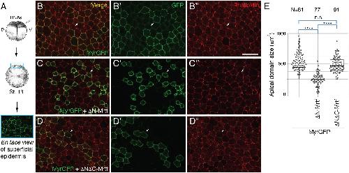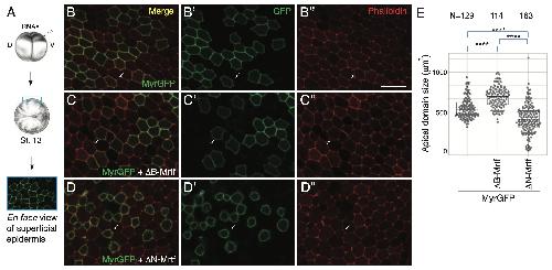 Fig. 4. Constitutively active Mrtf induces apical constriction in non-neural ectoderm. (A) Experimental scheme. (B-D″) Four-cell embryos were injected into one ventral-animal blastomere with MyrGFP RNA (25 pg) either alone (B-B″) or with 250 pg ΔN-Mrtf RNA (C-C″) or ΔNΔC-Mrtf RNA (D-D″). Superficial epidermal ectoderm of the injected embryos at stage 13 was imaged after phalloidin staining (B-D). Arrows indicate the cells mosaically expressing GFP. Scale bar: 50 [micrometers]. (E) Apical domain size of mosaic cells was measured. N=numbers of cells scored. Kruskal–Wallis test: ****P<0.0001; n.s., not significant. The box plot indicates the median and quartiles. |