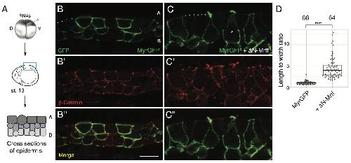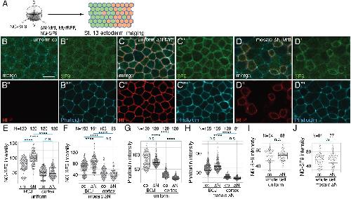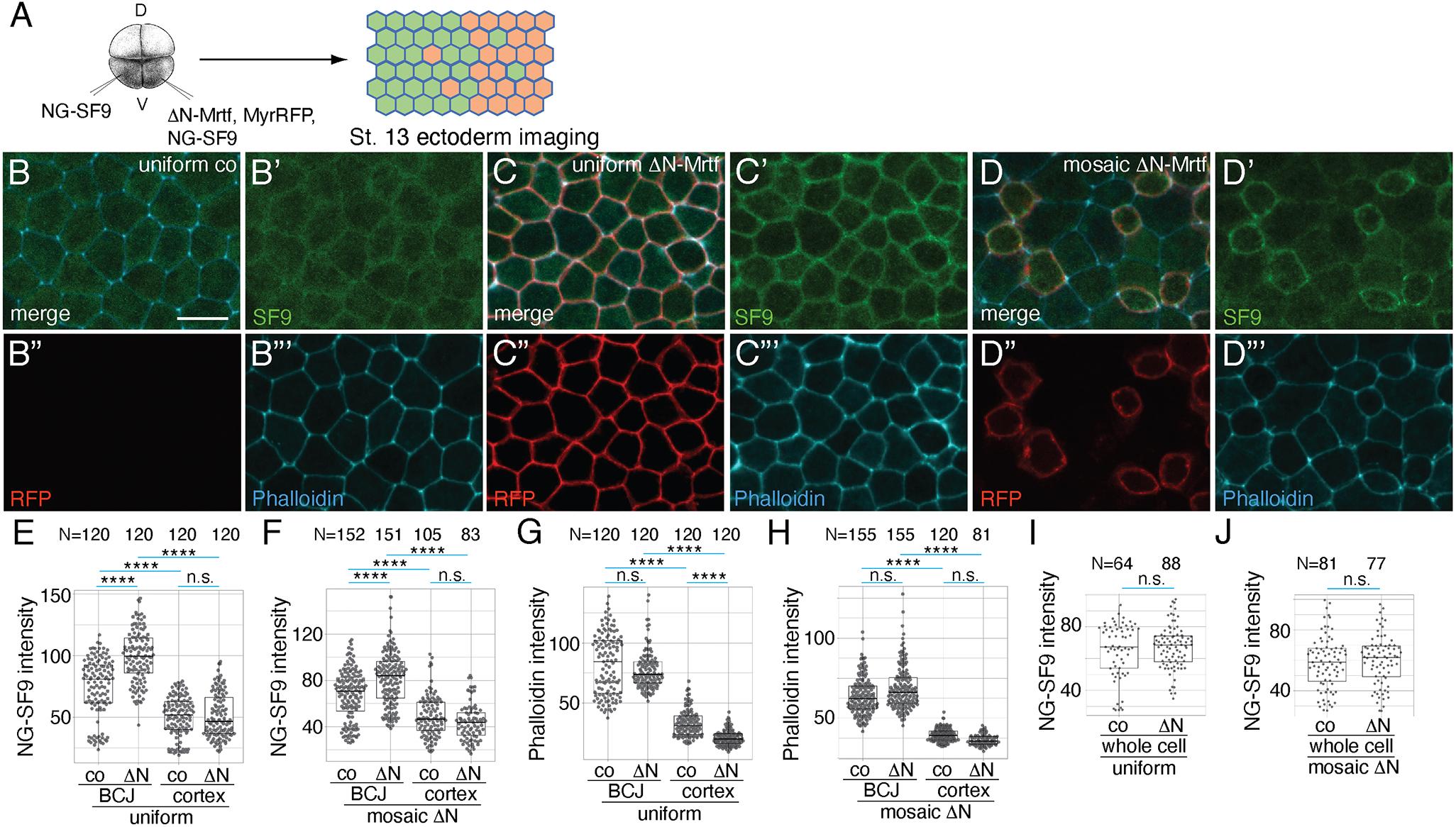 ΔN-Mrtf promotes the junctional accumulation of Myosin II. (A) Experimental scheme. Four-cell embryos were injected into one or the other ventral-animal blastomere with 25 pg mNeonGreen-SF9 (NG-SF9), 250 pg ΔN-Mrtf or 20 pg MyrRFP RNAs, as indicated. Injected embryos were fixed at stage 13, stained with phalloidin and imaged. (B-B‴) Ectoderm cells uniformly expressing NG-SF9 without MyrRFP (uniform co). (C-C‴) Ectoderm cells uniformly expressing NG-SF9 and ΔN-Mrtf labelled with MyrRFP. (D-D‴) Cells mosaically expressing ΔN-Mrtf and NG-SF9 are labelled with MyrRFP, surrounding cells express only NG-SF9. (E-H) Quantification of fluorescence intensity of NG-SF9 (E,F) and phalloidin (G,H) at bicellular junctions (BCJs) and medial apical cortex (cortex); control cells expressing NG-SF9 only (co) are compared with cells expressing ΔN-Mrtf, MyrRFP and NG-SF9 (ΔN). Intensities of NG-SF9 and phalloidin were measured at the junction between the mosaic ΔN-Mrtf-expressing cell and control cell (ΔN), or at the junction between control cells (co). (I,J) Quantification of total NG-SF9 levels (whole cell). N=numbers of cells or junctions measured. Scale bar: 20 [micrometers]. The Kruskal–Wallis test was used for E-H; the Mann–Whitney test was used for I,J: ****P<0.0001; n.s., not significant. The box plots indicate the median and quartiles. |