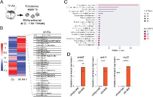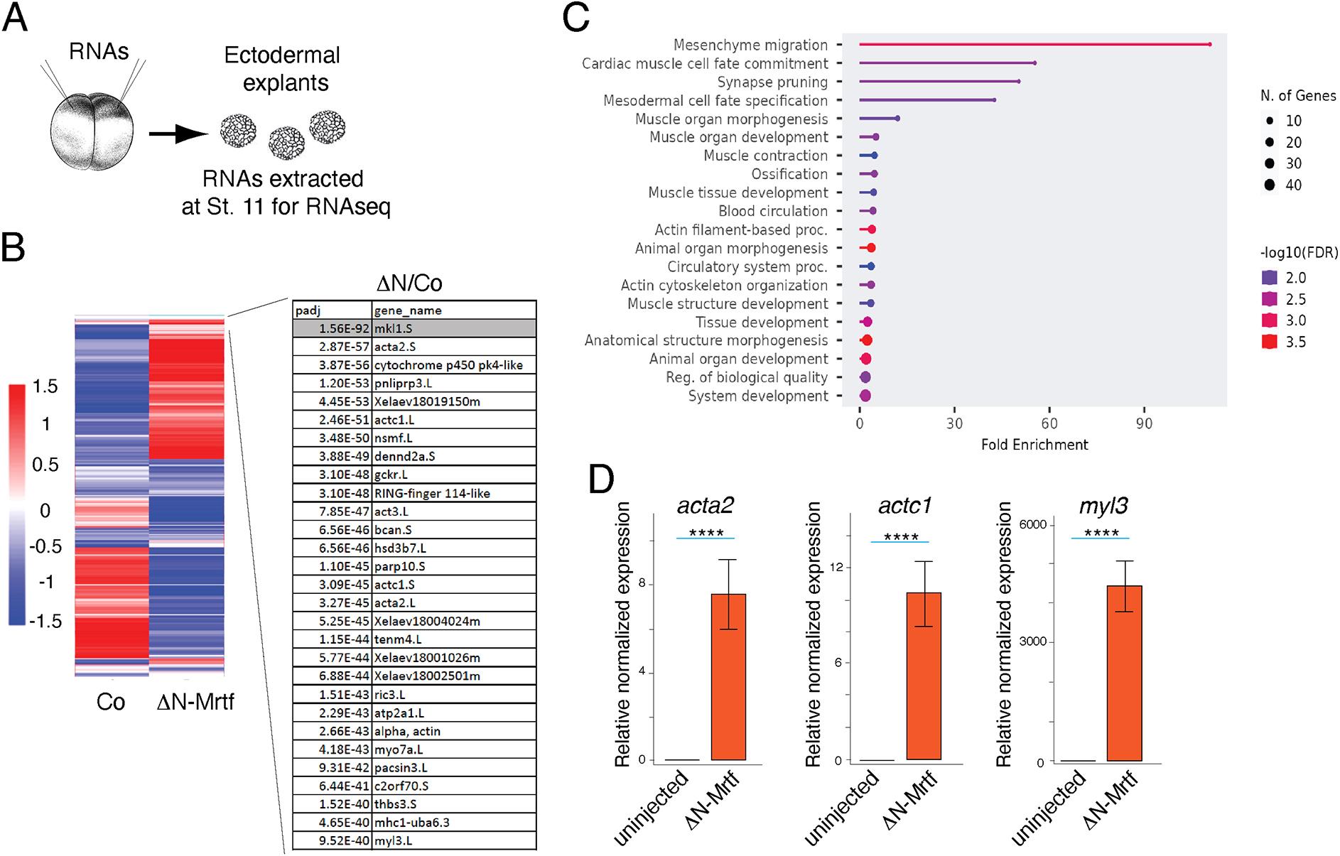 Fig. 8. Transcriptome analysis identifies putative Mrtf target genes. (A) Experimental scheme. Two-cell embryos were injected into two animal pole regions with 500 pg of ΔN-Mrtf RNA. Ectoderm explants were excised at stage 9-9.5. Total RNA was extracted when sibling embryos reached stage 11 for sequencing. (B) Heatmaps show relative expression of differentially expressed genes in the control and ΔN-Mrtf-expressing ectoderm. Top enriched genes are shown on the right, with adjusted P-value (Padj) indicated. (C) GO (gene ontology, biological processes) analysis of top 200 genes induced by ΔN-Mrtf. (D) Validation of acta2, actc1 and myl3 regulation by ΔN-Mrtf using quantitative RT-PCR. Mann–Whitney test: ****P<0.0001. |