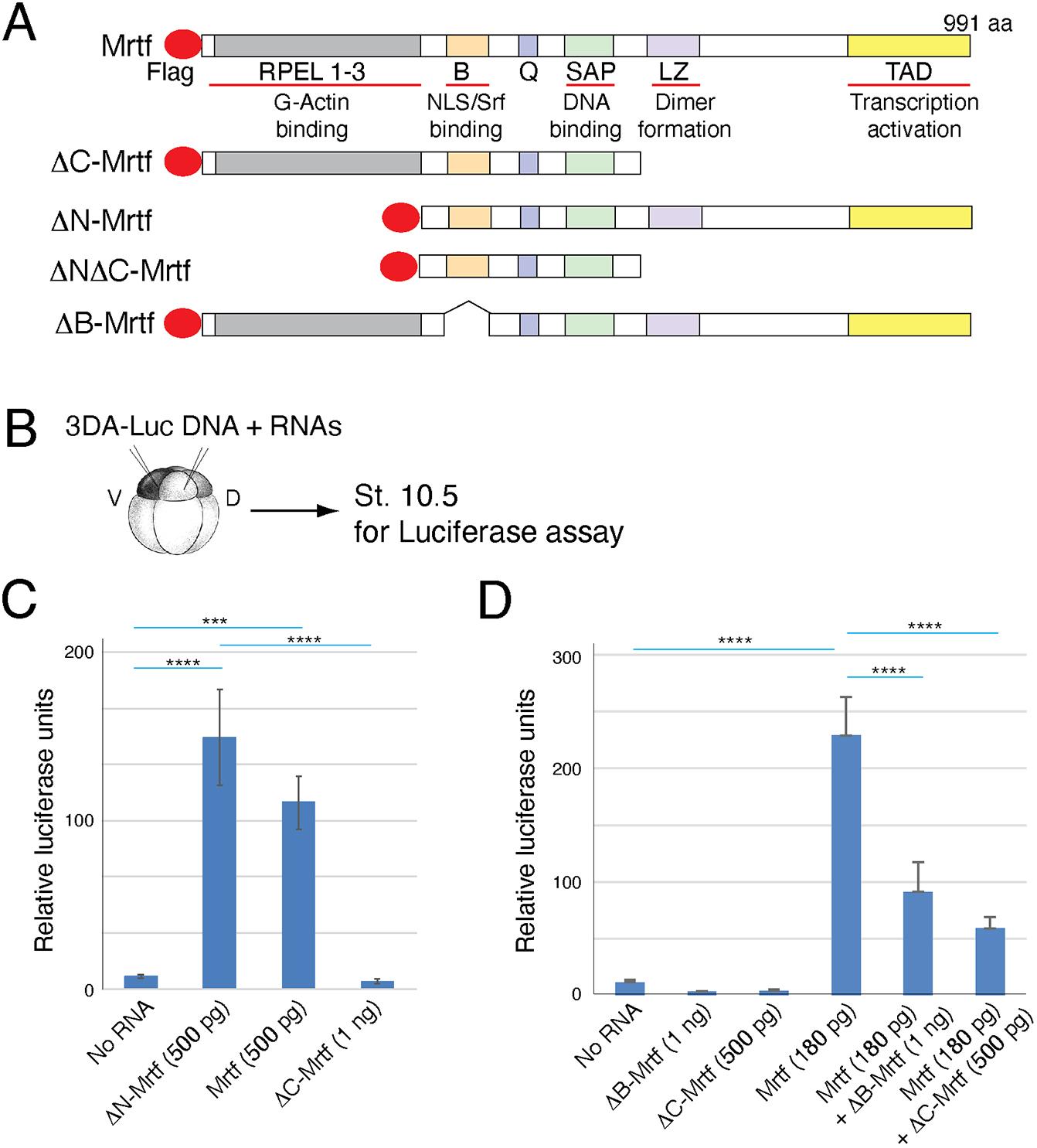 Fig. 1. Distinct effects of Mrtfa constructs on Srf reporter activation. (A) Domain structure of Mrtfa indicating G-actin binding, nuclear localization signal (NLS)/serum response factor (Srf) binding, DNA binding, dimer formation and transcriptional activation domains. (B) Experimental scheme for transient 3DA-Luc reporter assays in Xenopus ectoderm. (C) Transcriptional activation of 3DA-Luc DNA by wild-type Mrtfa, ΔC-Mrtfa and ΔN-Mrtfa constructs. (D) ΔC-Mrtfa and ΔB-Mrtf inhibit endogenous and exogenous Mrtf activity. Data are mean+/-s.d. and are representative of three to five independent experiments. One-way ANOVA Bonferroni's multiple comparison test: ***P<0.001, ****P<0.0001. |