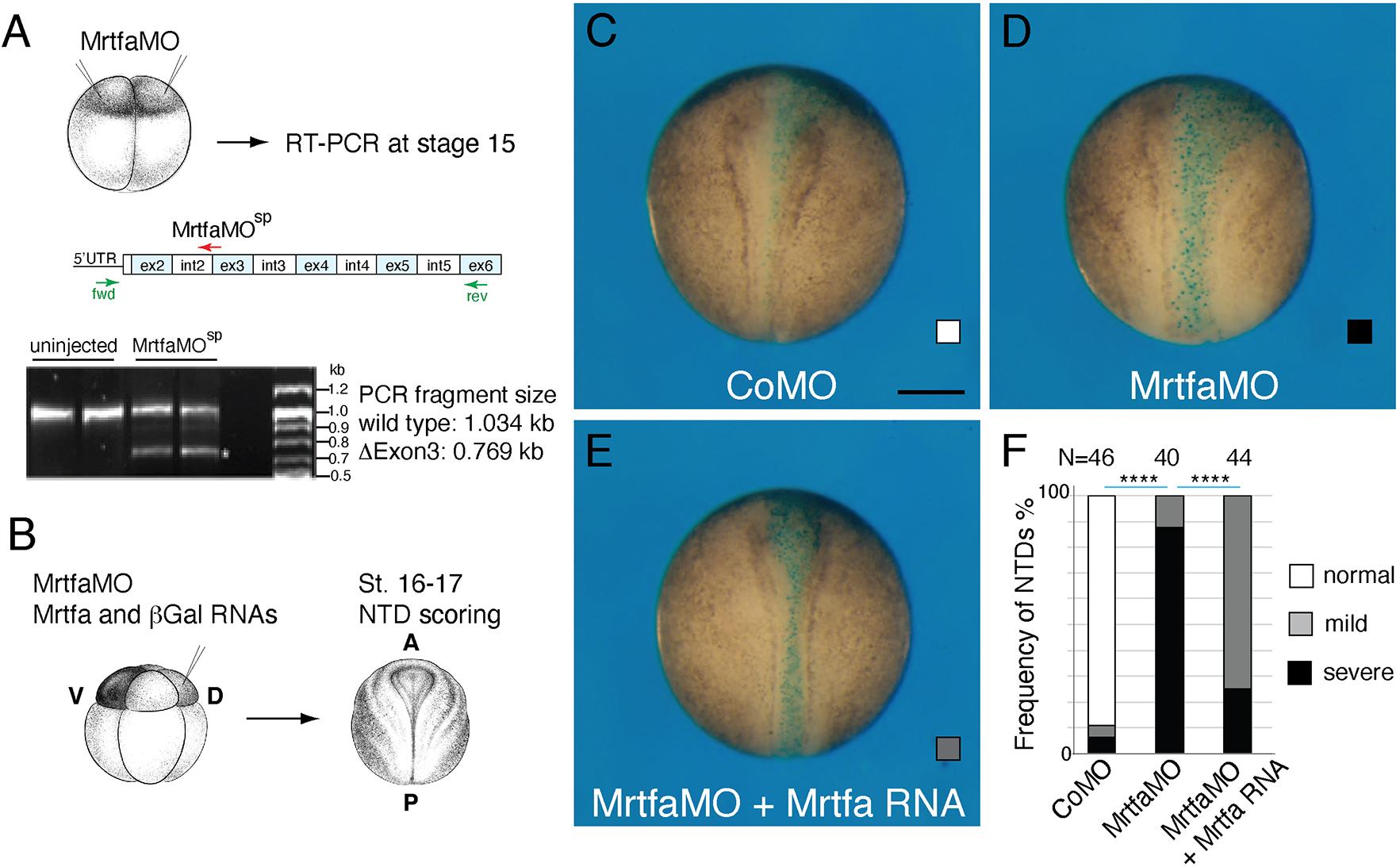 Fig. 2. Mrtfa is required for Xenopus neurulation. (A) Validation of Mrtfa knockdown. Experimental scheme. Embryos were injected animally with Mrtfa-MOsp (25 ng). Mrtfa gene structure with indicated exon (ex) and intron (int) boundaries is shown above the gel. Mrtfa-MOsp targets the junction of intron 2 and exon 3. RT-PCR with specific primers shows the removal of exon 3 in the morphants. The MO effect was analyzed in duplicate samples as indicated. The results are representative of two different experiments. (B-F) Neurulation defects in Mrtf morphants. (B) One dorso-animal site of eight-cell embryos was injected with control MO, with Mrtfa-MOsp (40 ng each) or with Mrtfa-MOsp, and with Mrtfa RNA (100 pg) and β-Gal RNA (40 pg), as indicated. Neural tube closure defects were assessed when control embryos reached stage 16-17. (C-E) Dorsal view of representative embryos, anterior is at the top. Scale bar: 300[micrometers]. (F) Quantification of the experiments shown in C-E. Neural tube closure defects were scored as severe, mild or normal. Phenotype frequencies and the total numbers of scored embryos are indicated for each group. Data are representative of three independent experiments. Chi-square test: ****P<0.0001. |