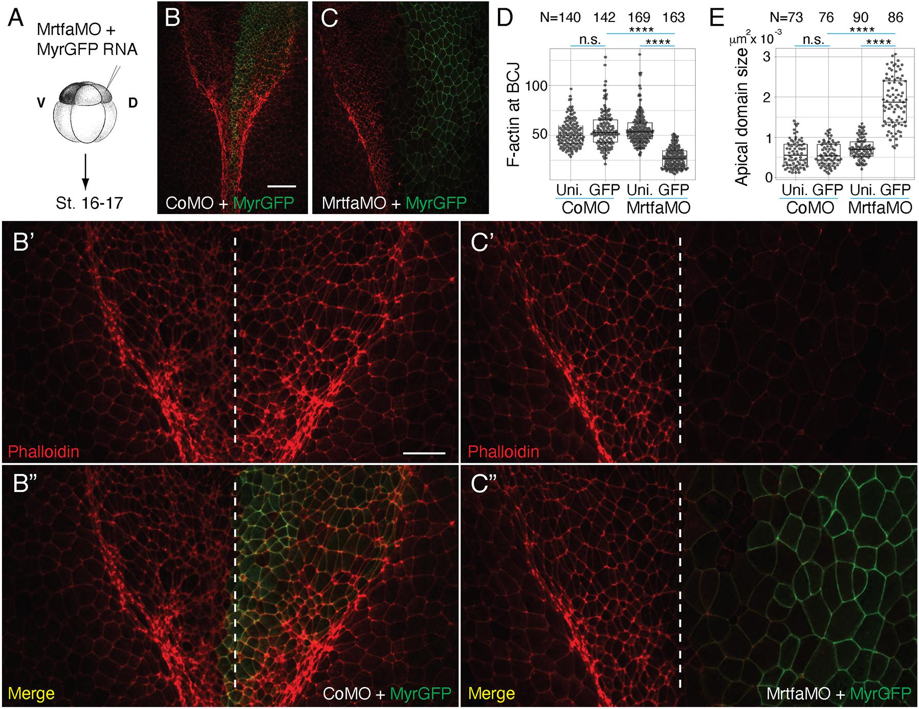 A. Experimental scheme. Four-cell embryos were injected into one-ventro-animal blastomere with MyrGFP RNA (50 pg) alone (B) or with 250 pg DN-Mrtf RNA (C), with 250 pg DN-Mrtf and 1 ng DC-Mrtf RNAs (D) or with 1 ng DC-Mrtf RNA (E).