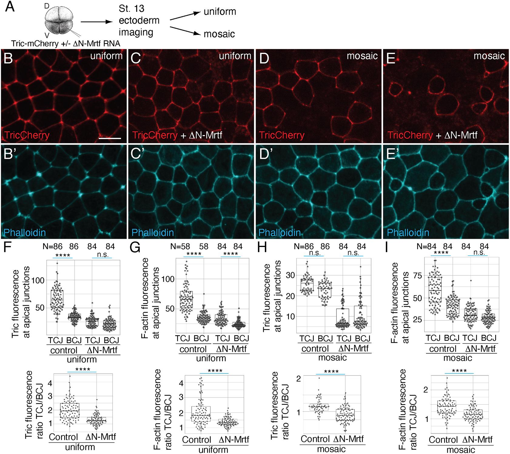 Fig. 5. Effects of ΔN-Mrtf on Tricellulin and F-actin at the tricellular junctions. (A) Experimental scheme. (B-E′) Four-cell embryos were injected into one ventral-animal blastomere with 25 pg Tricellulin-mCherry (TricCherry) RNA alone (B,B′,D,D′) or with 250 pg ΔN-Mrtf RNA (C,C′,E,E′). Stage 13 embryos were fixed and stained with phalloidin. (B-E) Representative ectoderm images with uniform (B,C) or mosaic (D,E) TricCherry expression; (B′-E′) phalloidin staining. Scale bar: 20 [micrometers]. (F-I) Quantification of TricCherry (F,H) or F-actin (G,I) fluorescence intensity at tricellular (TCJs) and bicellular (BCJs) junctions (top row). Quantification was carried out for cells with uniform (F,G) or mosaic (H,I) expression of Tric-Cherry alone (control) or with ΔN-Mrtf. Intensities of Tric and F-actin were measured at the junction between a mosaic and wild-type cell. Bottom row: ratios of fluorescence intensity at TCJs over BCJs. N=numbers of junctions scored. The Kruskal–Wallis test was used for the top four graphs; the Mann–Whitney test was used for the bottom four graphs: ****P<0.0001; n.s., not significant. The box plots indicate the median and quartiles. |