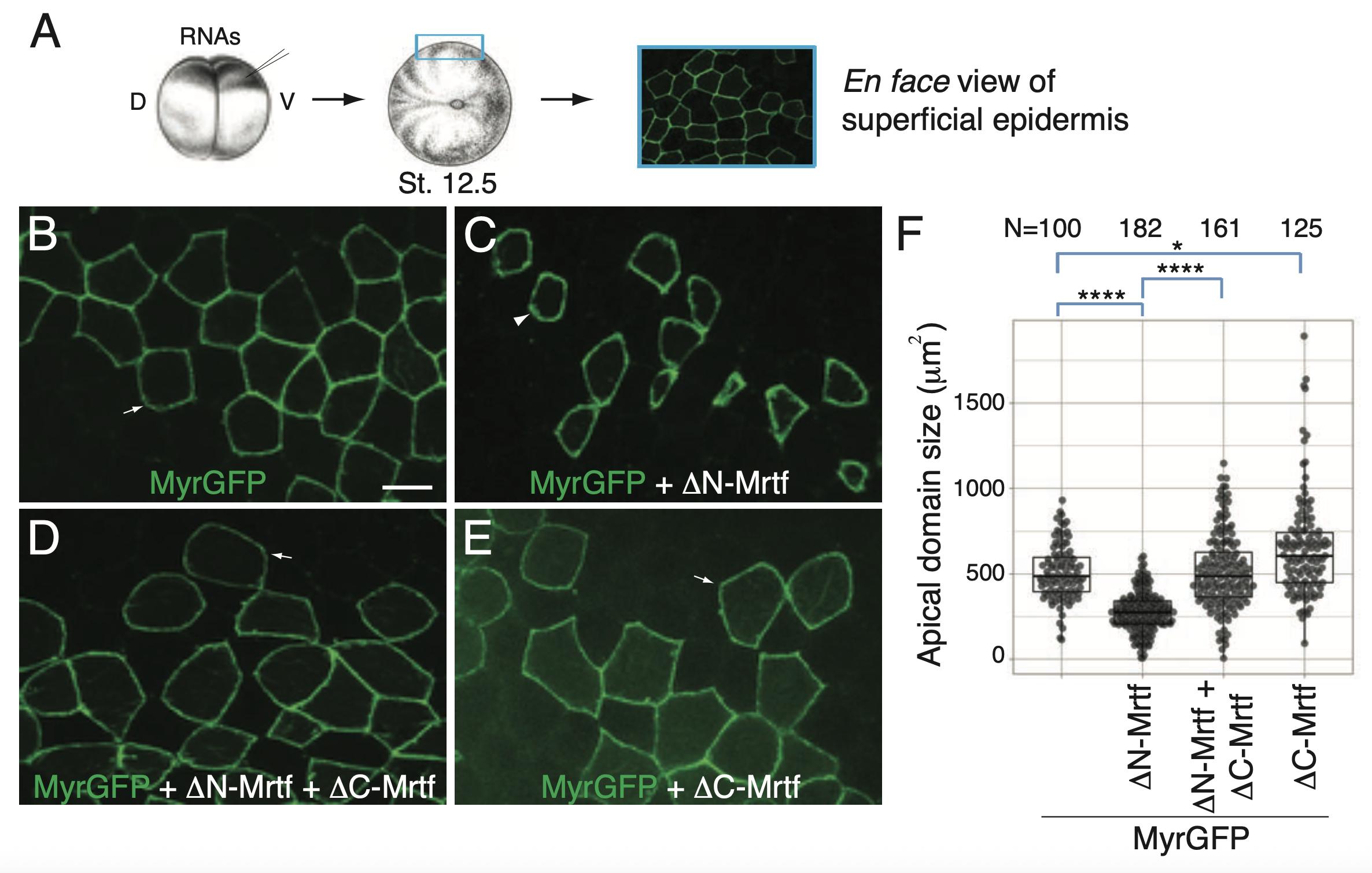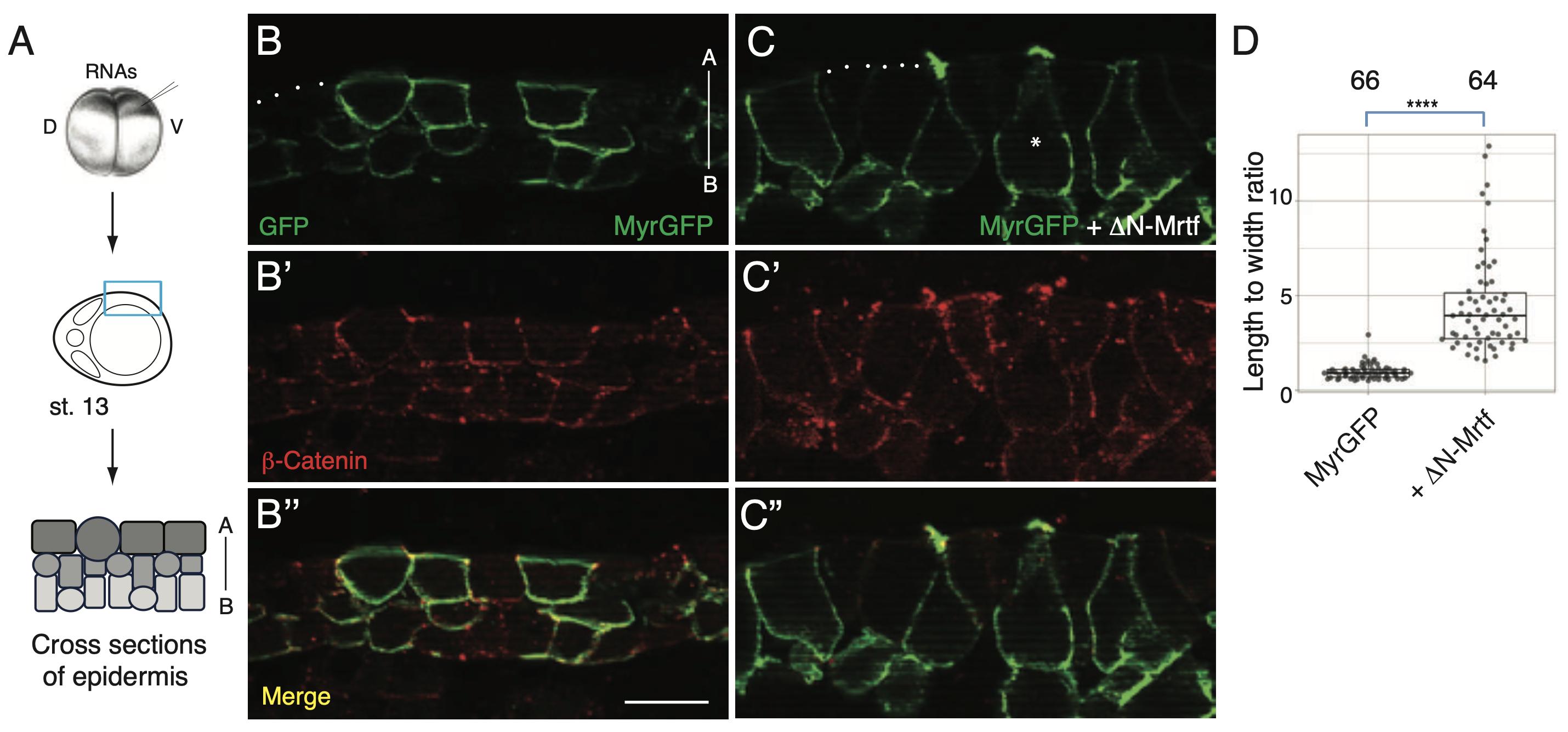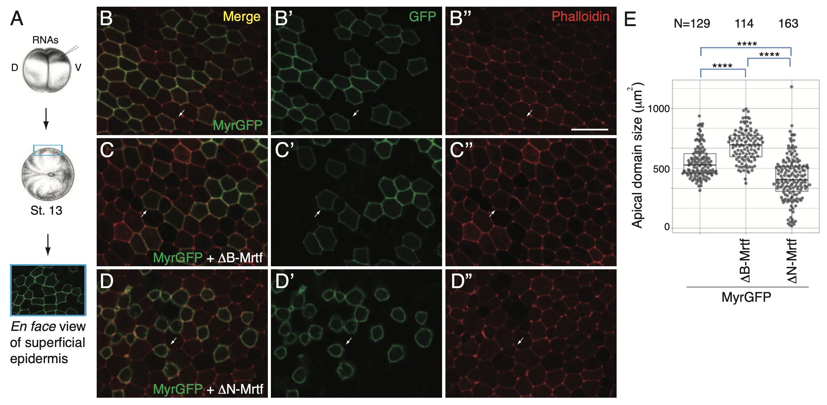 A. Experimental scheme. Four-cell embryos were injected into one ventral-animal blastomere with MyrGFP RNA (25 pg) alone (B) or with 250 pg DB-Mrtf RNA (C), or with 250 pg DN-Mrtf RNA (D). Superficial epidermal ectoderm of the injected embryos at stage 13 was imaged after phalloidin staining (B-D). Arrows point to the cells mosaically expressing GFP.