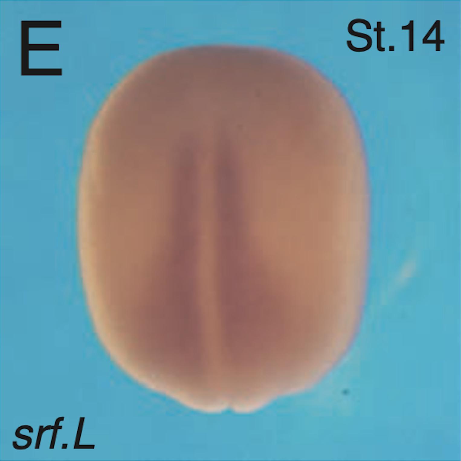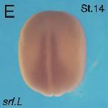srf.L (serum response factor) gene expression in Xenopus laevis embryo via in situ hybridization, NF stage (14), dorsal view with anterior [A] top and posterior [P] bottom. |