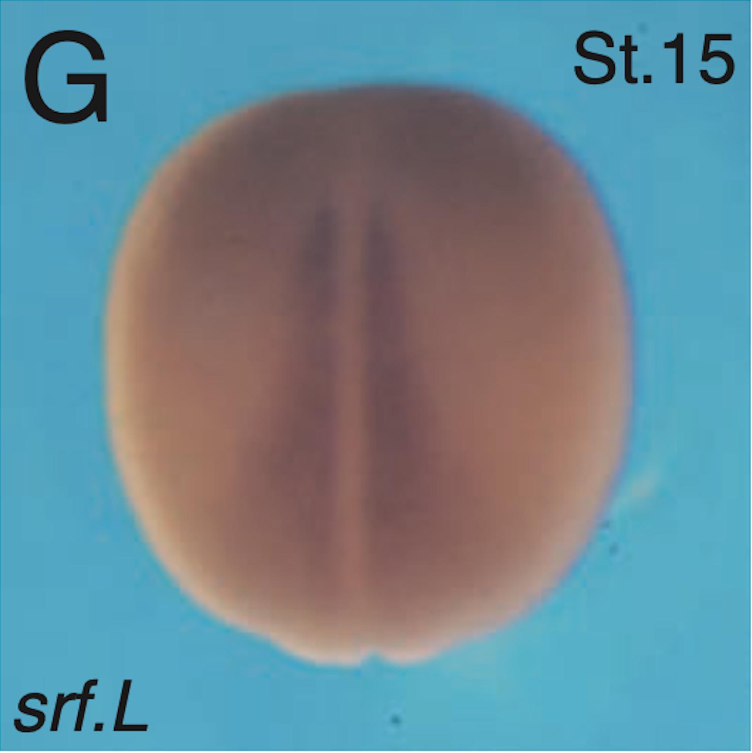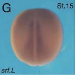 srf.L (serum response factor) gene expression in Xenopus laevis embryo via in situ hybridization, NF stage (15), dorsal view with anterior [A] top and posterior [P] bottom. |