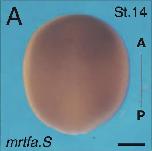 mrtfa.S (myocardin related transcription factor A) gene expression in Xenopus laevis embryo via in situ hybridization, NF stage (14), dorsal view with anterior [A] top and posterior [P] bottom. |