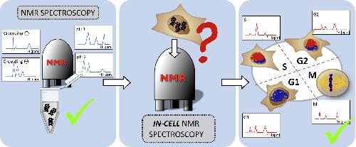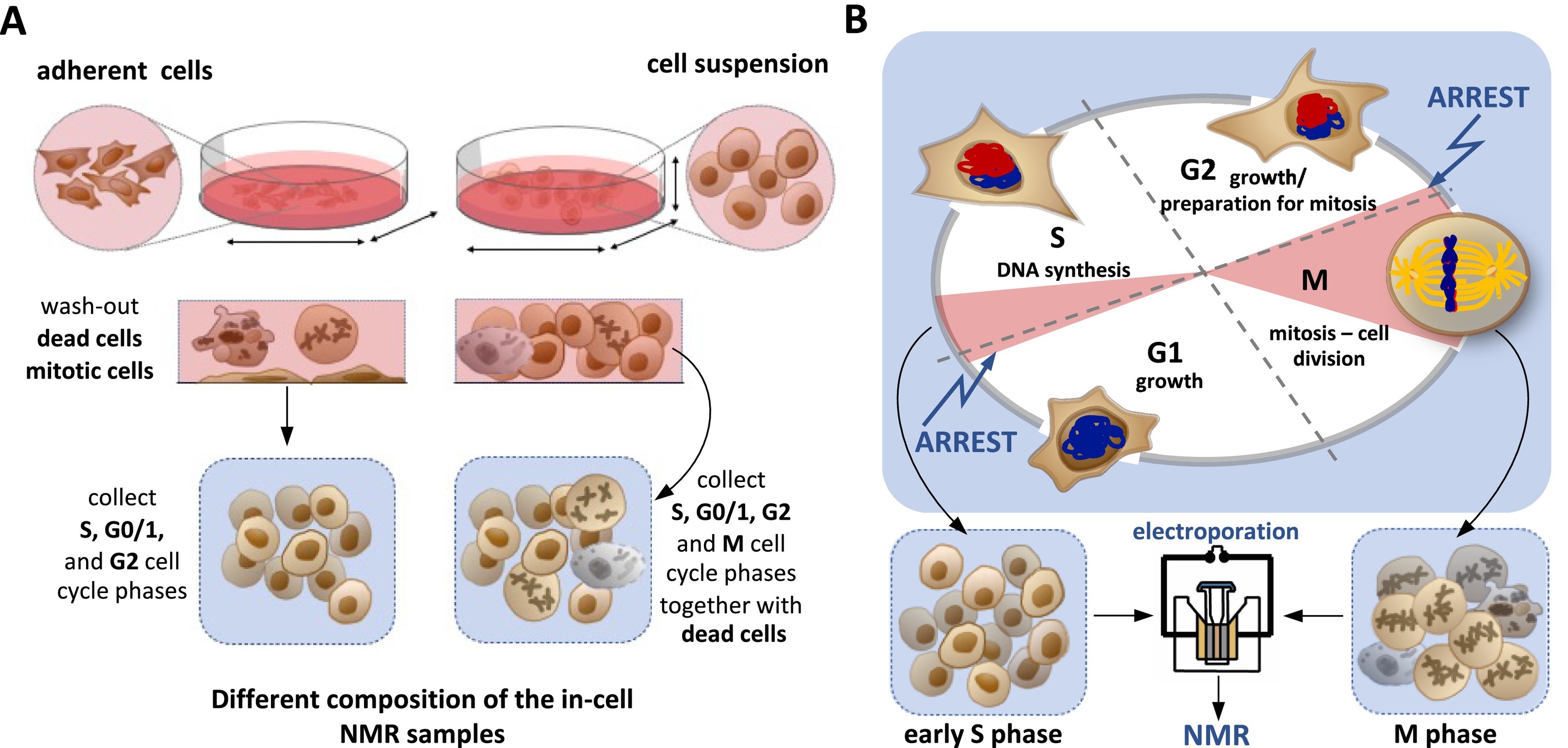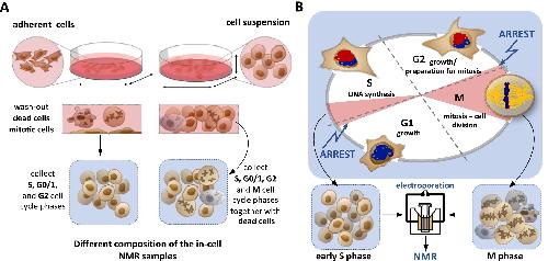 Fig. 11. (A) Cell culture types (adherent cells vs. cells growing in suspension) and their manipulations create microscopic (environmental) heterogeneity in in-cell NMR samples. Cells in various physiological states in the in-cell NMR sample can bias the interpretation of in-cell NMR data. (B) Schematic representation of the pre-synchronization strategy introduced by Viskova et al. [28] to allow for in-cell NMR studies in cell cycle phase synchronized cells. In their approach, the cells are chemically synchronized in a single physiological state before NA target delivery. |
