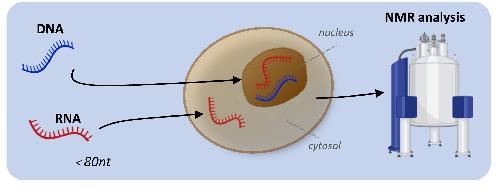 Fig. 1. Schematic representation of an in-cell NMR experiment on NA-based targets. The NA targets, typically less than 80 nucleotides in size, are introduced into the intracellular space of living cells from outside. Transfected cells are then subjected to NMR analysis. |