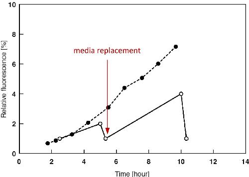 Fig. 6. Time dependence for the fluoresceine 5′-tagged d(GCGAAGC) substrate leakage out of X. laevis oocytes after manual injection. The leakage was assayed by measuring the fluorescence intensity of the buffer surrounding the injected oocytes relative to the fluorescence intensity of a reference sample. The filled circles connected with a dashed line indicate the increase in fluorescence due to leakage of the DNA out of the injected oocytes. The open circles connected with a solid line represent the data from the buffer exchange experiment. Figure adapted with permission from Hänsel et al. [13]. Copyright 2009 American Chemical Society. |