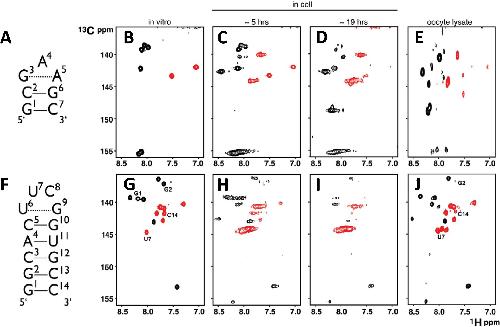 Fig. 7. The designation of the NA target limit available in the time window for in-cell NMR analysis. A) and (F) Schematic representations of secondary structures for d(GCGAAGC) and r(GGCACUUCGGUGCC), respectively. (B) and (G) aromatic regions of the in vitro 2D [1H–13C]-CT-TROSY-HSQC spectra of 13C/15N-labelled d(GCGAAGC) and r(GGCACUUCGGUGCC), respectively. (C) and (D) aromatic regions of the in-cell 2D [1H–13C]-CT-TROSY-HSQC NMR spectra of 13C/15N-labelled d(GCGAAGC) recorded approximately 5 and 19 h after microinjection of the X. laevis oocytes. (H) and (I) Analogous spectra to (C) and (D) for the 13C/15N-labelled r(GGCACUUCGGUGCC). (E) and (J) in vitro spectra of the 13C/15N-labelled d(GCGAAGC) and r(GGCACUUCGGUGCC) in cleared oocyte lysates, prepared by the processing of injected oocytes after in-cell NMR data acquisition. The black (positive) and red (negative) signals correspond to purines and pyrimidines, respectively. The difference in the sign of the purine and the pyrimidine peaks is due to using a constant-time mode of the experiment. Figure adapted with permission from Hänsel et al. [13]. Copyright 2009 American Chemical Society. (For interpretation of the references to colour in this figure legend, the reader is referred to the web version of this article.) |