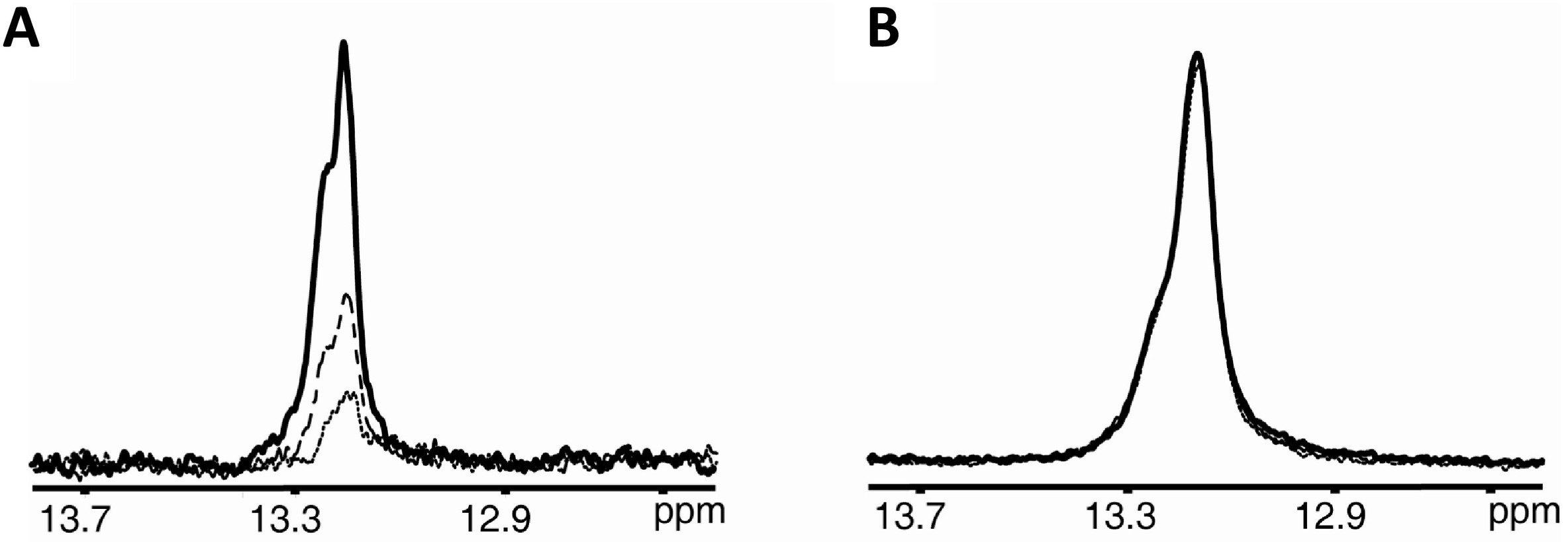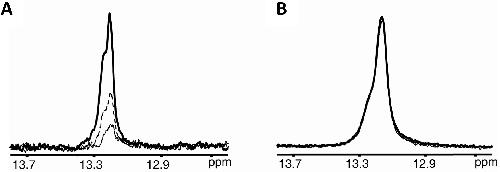 Fig. 9. Chemical modifications can be used to increase the resistance of DNA targets to endogenous nuclease activities. For instance, the stability of the phosphorothioate-modified d(GCGAAGC) substrate in a crude oocyte extract was monitored via analysis of the imino region of the 1D 1H in-cell NMR spectra of the d(G*CGAAGC) (A) and d(G*C*GAAGC) (B) substrates (the asterisks indicate the position(s) of the thiophosphate modification). The solid lines correspond to spectra acquired 30 min after adding the substrate to the crude oocyte extract. The dashed and dotted lines correspond to spectra acquired 180 and 360 min after the DNA construct addition to the extract. Figure adapted with permission from Hänsel et al. [13]. Copyright 2009 American Chemical Society. |