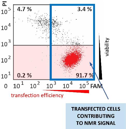 Fig. 12. Illustrative example of flow cytometry (FCM) plot and its interpretation. The plot provides information on a so-called transfection efficiency, i.e., levels of NA target delivered into cells and uniformity of NA target levels in the transfected cells (x-axis), and at the same time, ratio of viable/dead transfected cells contributing to the NMR signal. Typically, 105 cells from an in-cell NMR sample are analyzed by flow cytometry. In the FCM plots, the percentages of viable nontransfected cells, viable NA target-containing cells,