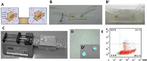 Fig. 15. Illustration of using a microfluidic-based approach exploiting volume exchange for convective transfer (VECT) to deliver 12 base-pair DNA target into HeLa cells. (A) Schematic representation of the VECT principle. (B) Microfluidic chip (expansion shown in B′); courtesy of Prof. Todd Sulchek and Dr. S. Chen (Georgia Institute of Technology, USA). (C) Instrumental setup used for VECT-based transfection. (D) and (E) confocal images and FCM plot of the transfected cells. Green and blue colors in (D) indicate the localization of FAM-labelled DNA fragment and Hoechst-stained nuclear DNA. The viability of transfected cells and transfection efficiency were determined by double-staining (DNA-PI/DNA-FAM). For an interpretation of the FCM plot, see Fig. 15. The data in (D) and (F) were acquired by J. Rynes and V. Zlinska, co-authors of this review. (For interpretation of the references to colour in this figure legend, the reader is referred to the web version of this article.) |