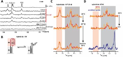 Fig. 8. Illustrative example of the degradation control experiment. Imino regions of the 1D 1H NMR spectra of d(G3(TTAG3)3T) in intracellular buffer (A), injected oocytes (B), cleared lysate (C), the intracellular buffer after butanol recovery of DNA from the cleared lysate (D). Note the evident difference between spectral fingerprints in the intracellular buffer (A) and the cleared lysate (C). While the spectrum in the buffer corresponds to a single conformation, namely to the 2-tetrad anti-parallel basket, the spectrum in the lysate suggests the coexistence of multiple G-quadruplex conformations. The matching between the spectral patterns (A) and (D) confirms that observed differences between in vitro and in-cell/clear lysate spectra are not due to DNA degradation. Figure adapted with permission from Hänsel et al. [13]. Copyright 2009 American Chemical Society. |