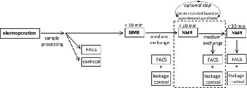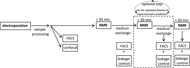 Fig. 20. The process of planning a discontinuous in-cell NMR experiment, including measurements on pelleted cells interleaved with medium exchange. The time for acquiring in-cell NMR data should not significantly exceed 30 min, so as to minimize the effects of cell starvation and sample acidification due to anaerobic production of lactate. |