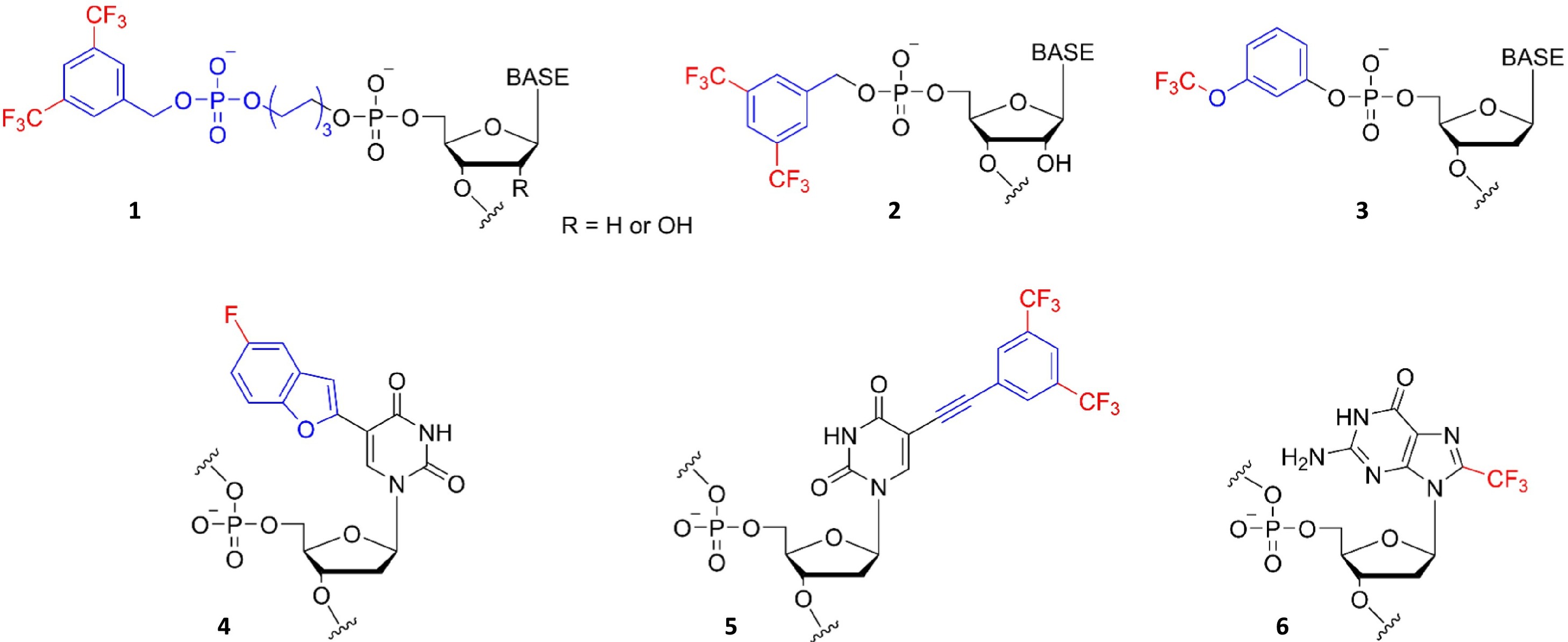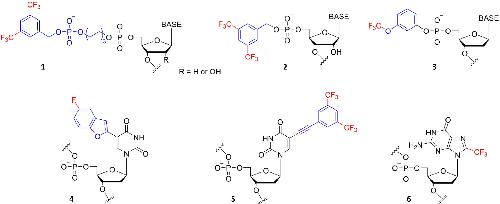 Fig. 22. Overview of 19F modifications used for in-cell NMR studies of NA targets: 3,5-bis(trifluoromethyl)benzyl moiety links to the oligonucleotide 5′-terminus via a hexyl spacer (1) [16,18]; 3,5-bis(trifluoromethyl)benzyl (2) and 3-(trifluromethoxy)phenyl moieties (3) directly linked to the 5′-terminus of the oligonucleotide target [29]; fluorobenzofuranyl moiety incorporated into the position 5 of thymine (4) [17]; (3,5-bis(trifluoromethyl)phenyl)ethynyl moiety (5) attached to the 8-position of 2′-deoxyguanosine [82]; a trifluoromethyl group internally incorporated into position 8 of 2′-deoxyguanosine (6) [83,116]. |
