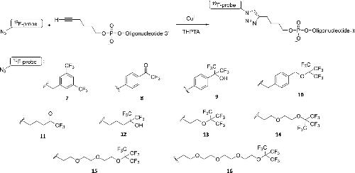 Fig. 23. A post-synthetic approach to modify oligonucleotide targets with 19F-based probes. (TOP) Schematic representation of a post-synthetic labelling approach based on a CuAAC coupling of a fluorine-containing azide with 5′-terminally alkynylated oligonucleotide. (BOTTOM) examples of fluorinated azide-based derivatives suitable for (in-cell) 19F NMR applications (cf. [117]); 3,5-bis(trifluoromethyl)benzylazide (7), 1-(4-azidophenyl)-2,2,2-trifluoroethanone (8), 2-(4-azidophenyl)-1,1,1,3,3,3-hexafluoropropan-2-ol (9), 4-.