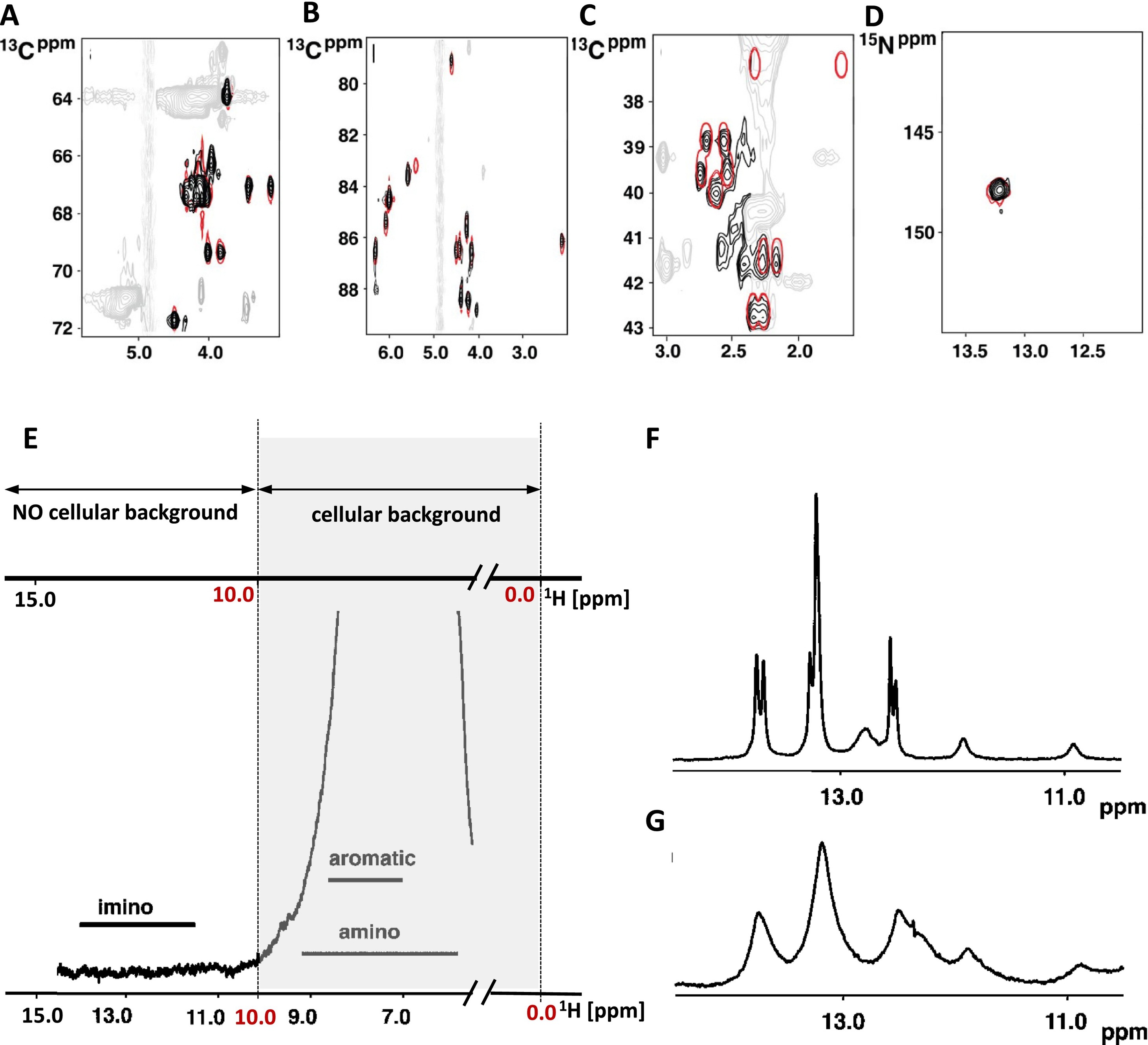 Fig. 4. Interference of the Xenopus laevis spectral background with signals from exogenous NA. The selected regions show in-cell 2D [1H − 13C]-CT-TROSY-HSQC (A, B, and C) and the [1H − 15N]-SOFAST-HMQC (D) NMR spectra of 13C and 15N-labelled d(GCGAAGC). The signals in black and red correspond to in-cell and to the reference in vitro spectra of d(GCGAAGC), respectively. Of the red signals, only the first contour level is shown. The signals from the oocyte spectral background are displayed in grey. (E) 1D 1H NMR spectrum of X. laevis oocytes. The spectrum region between 0 to ∼10 ppm contains signals from the cellular background, while no signals from cellular components are present in a region between 10 to ∼16 ppm. (F) and (G) Imino region of the 1D 1H in vitro and in-cell NMR spectrum of the O2′-methylated RNA, r(GGCACUUCGGUGCC). While the signals in the in vitro and in-cell NMR spectra exhibit identical chemical shifts, the signals in the in-cell NMR spectrum are significantly broader than those in the in vitro spectrum. The broadening results from in-cell NMR sample heterogeneity as well as reduced molecular tumbling of the NA target due to the intracellular space visco-elasticity. Figure adapted with permission from Hänsel et al. [13]. Copyright 2009 American Chemical Society. (For interpretation of the references to colour in this figure legend, the reader is referred to the web version of this article.) |